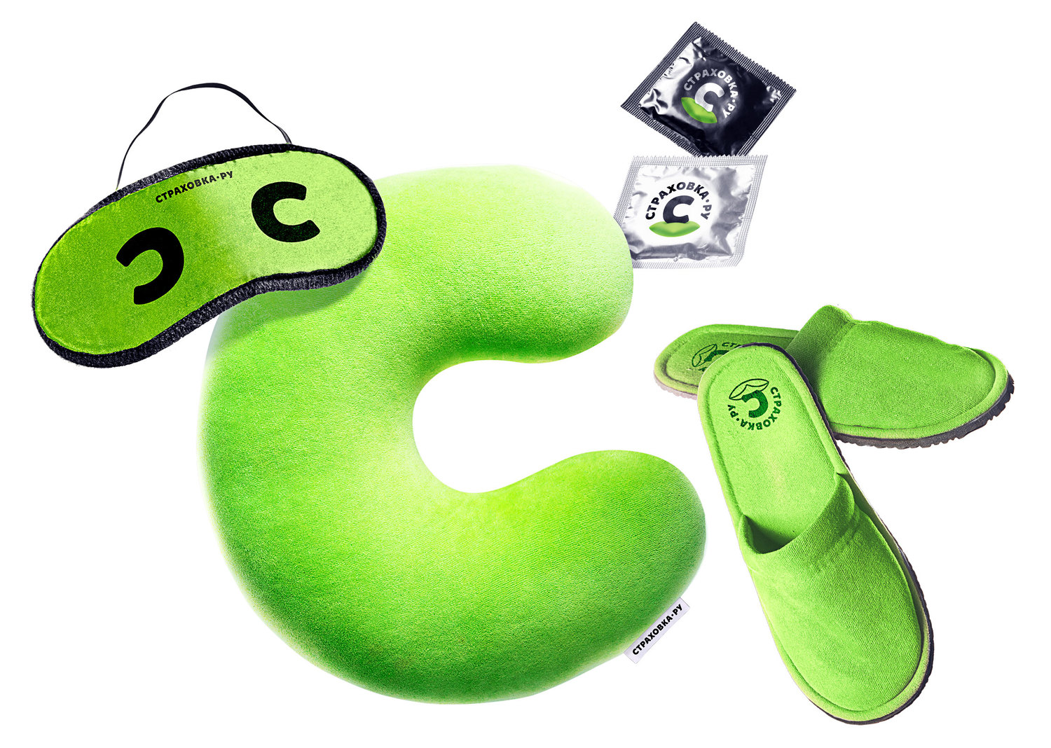 A concept of souvenirs that somehow relate to insurance and protection from dangers was created at the studio. Slippers protect feet from the clod floor and the sleeping mask protects eyes from light.