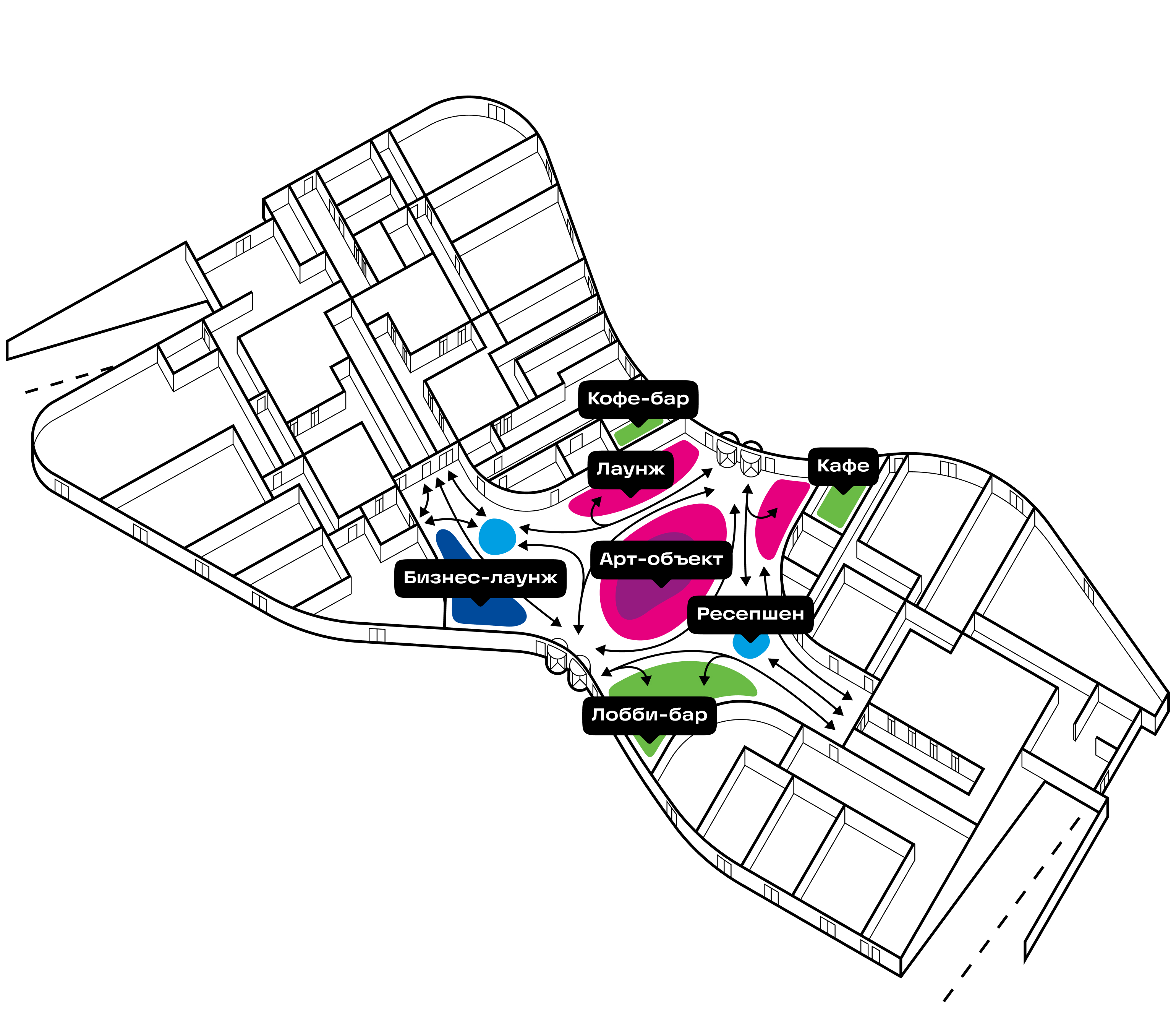After analyzing user journeys, we decided to optimize the routes by linking the residential areas with the restaurant. The original layout assumes that guests enter it from the street. Instead, it is necessary to create an additional passage to the restaurant elevators through the grand lobby, so that residents do not cross paths with other visitors and at the same time do not have to go outside in evening dress.