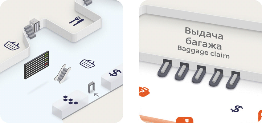 Stairs, escalators, elevators, departure boards and baggage claim areas are marked with 3D images of the objects.