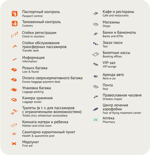 Icons are divided into groups. Airport services are colored orange, supplementary services are colored dark blue, and pharmacy icons are green.
