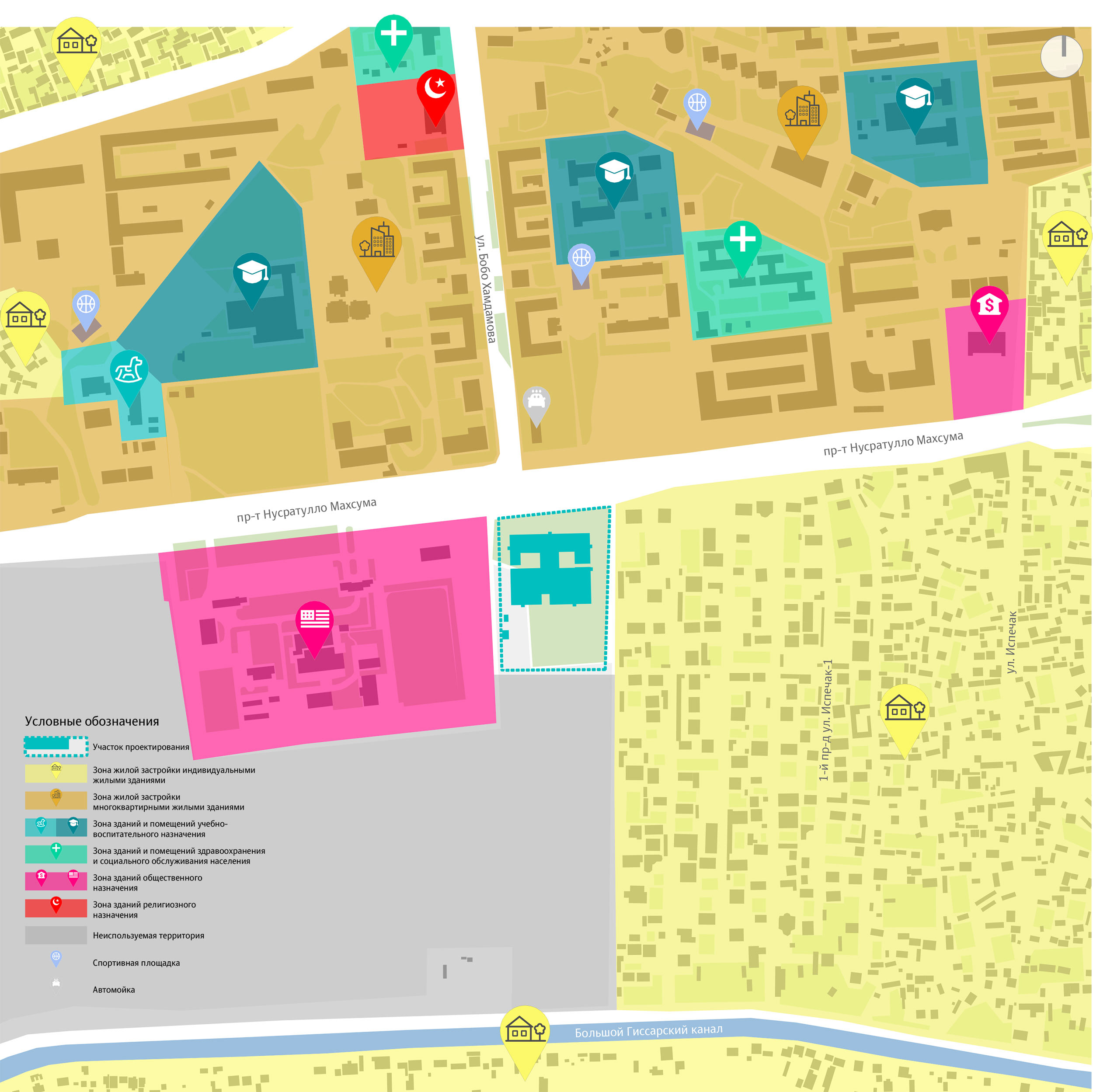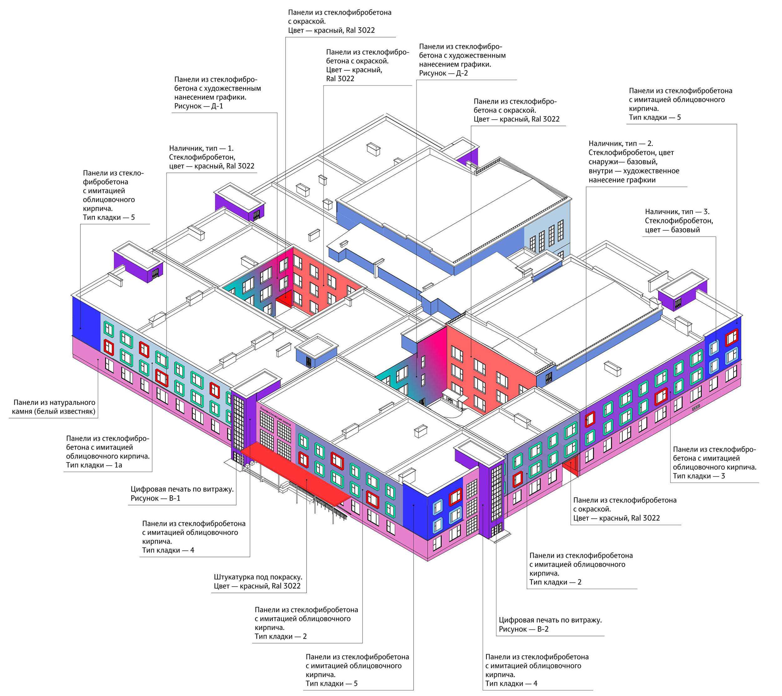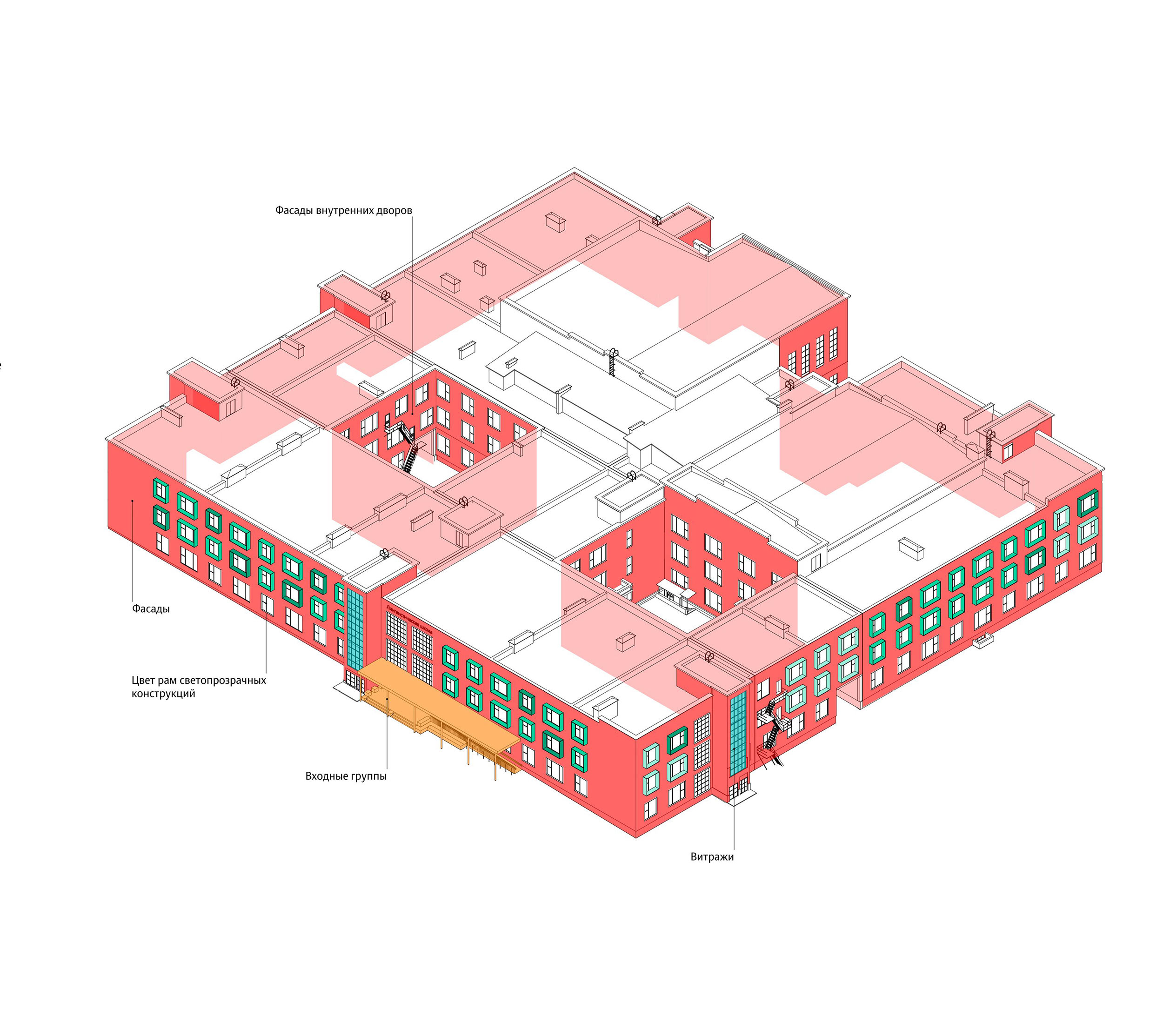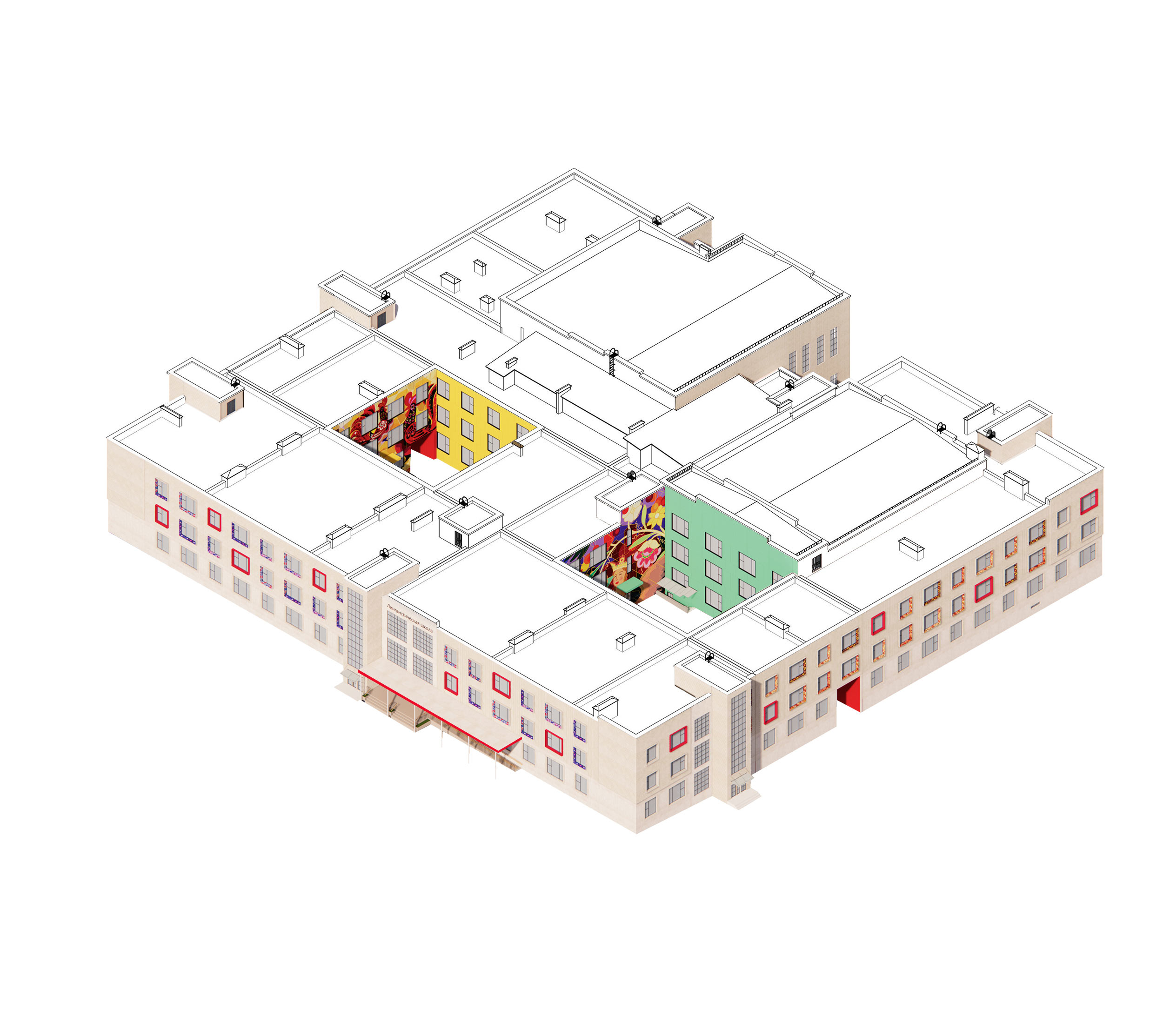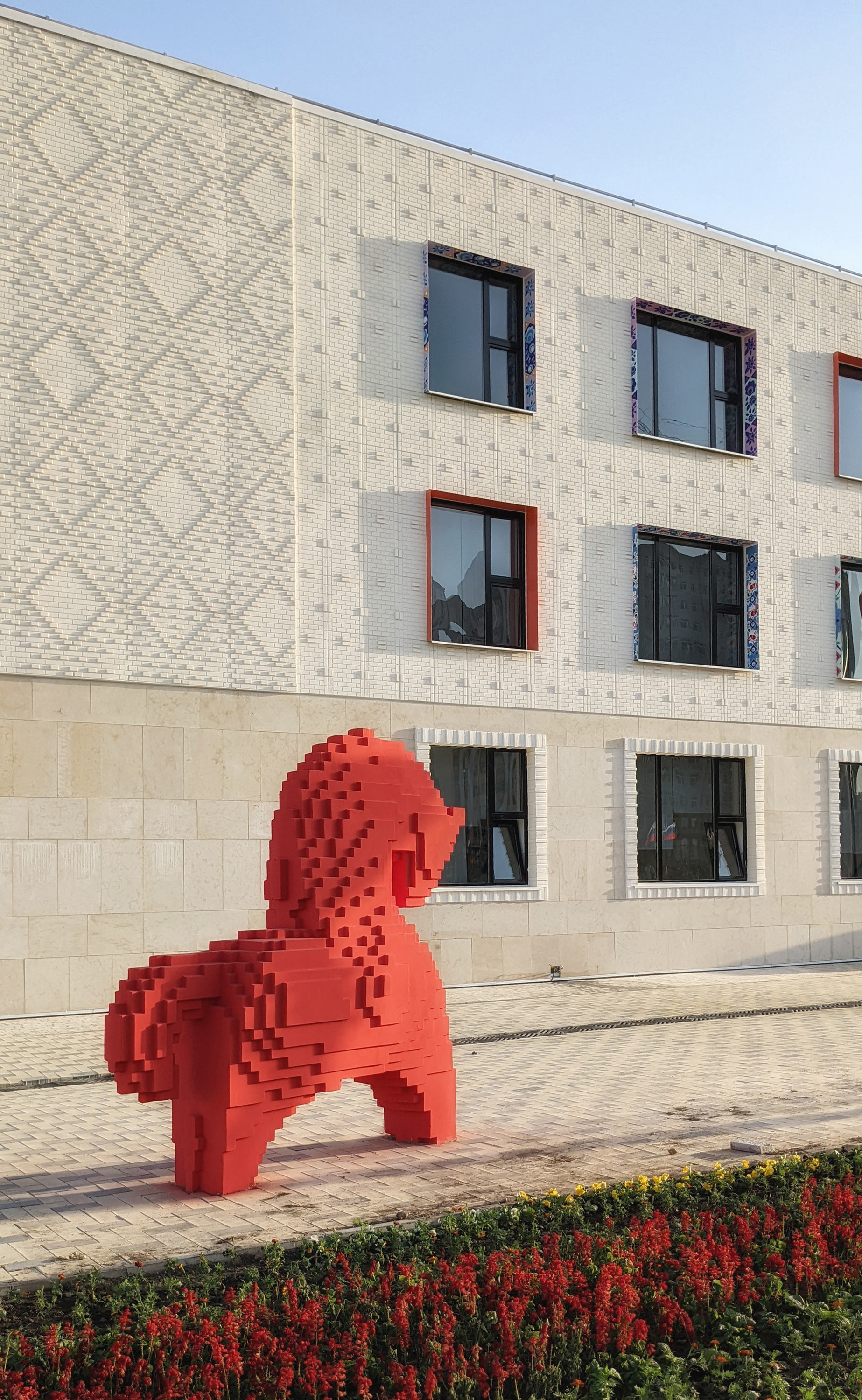 On September 1, 2022 general education schools offering instruction in Russian opened in five cities in Tajikistan: Dushanbe, Kulob, Tursunzoda, Khujand and Bokhtar. Façade design based on the standard project that reflects the shared history and harmony of Tajikistan and Russia was created in the studio, connecting graphic art traditions of the two cultures through illustrations, materials and details.