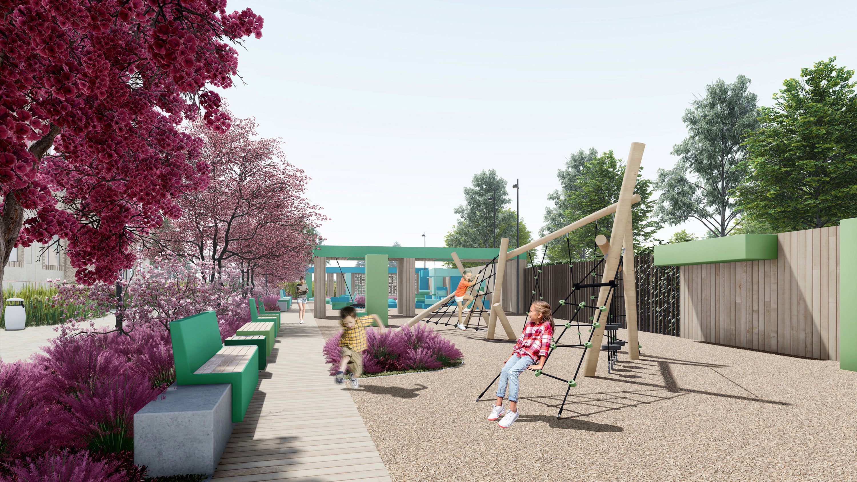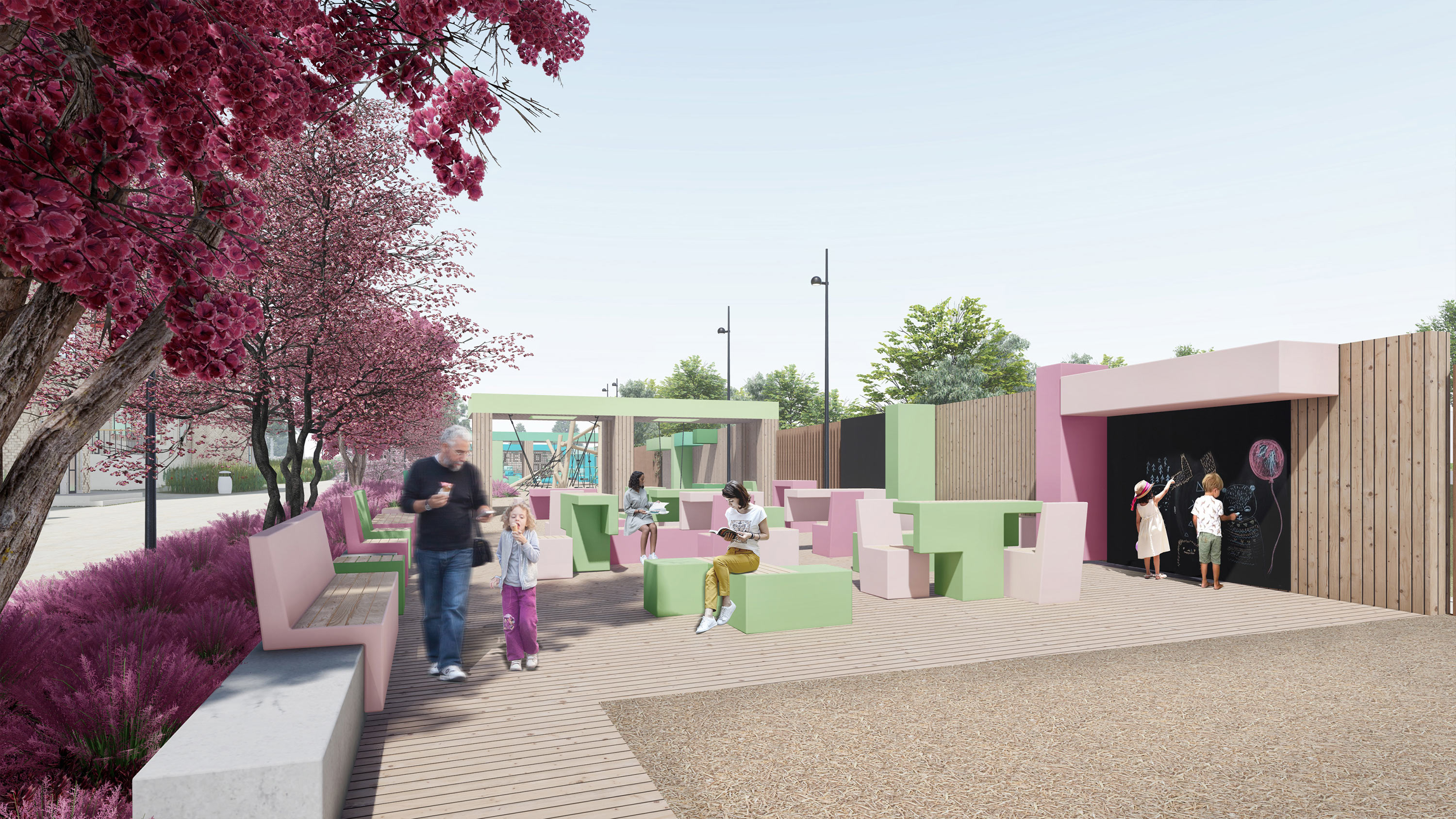 Functional amenities introduce points of attraction to the area that take into account different ages of visitors and their varying interests.