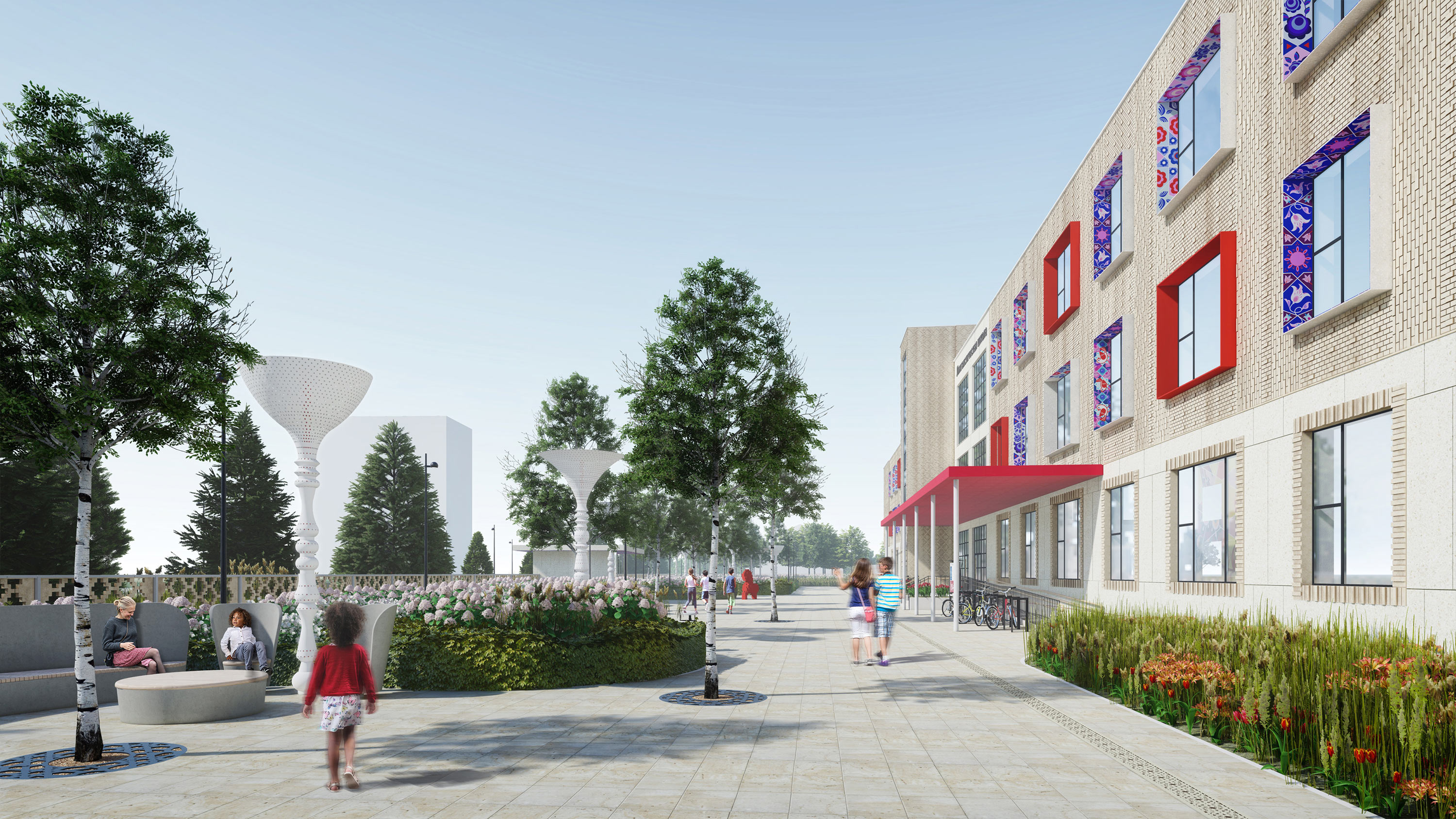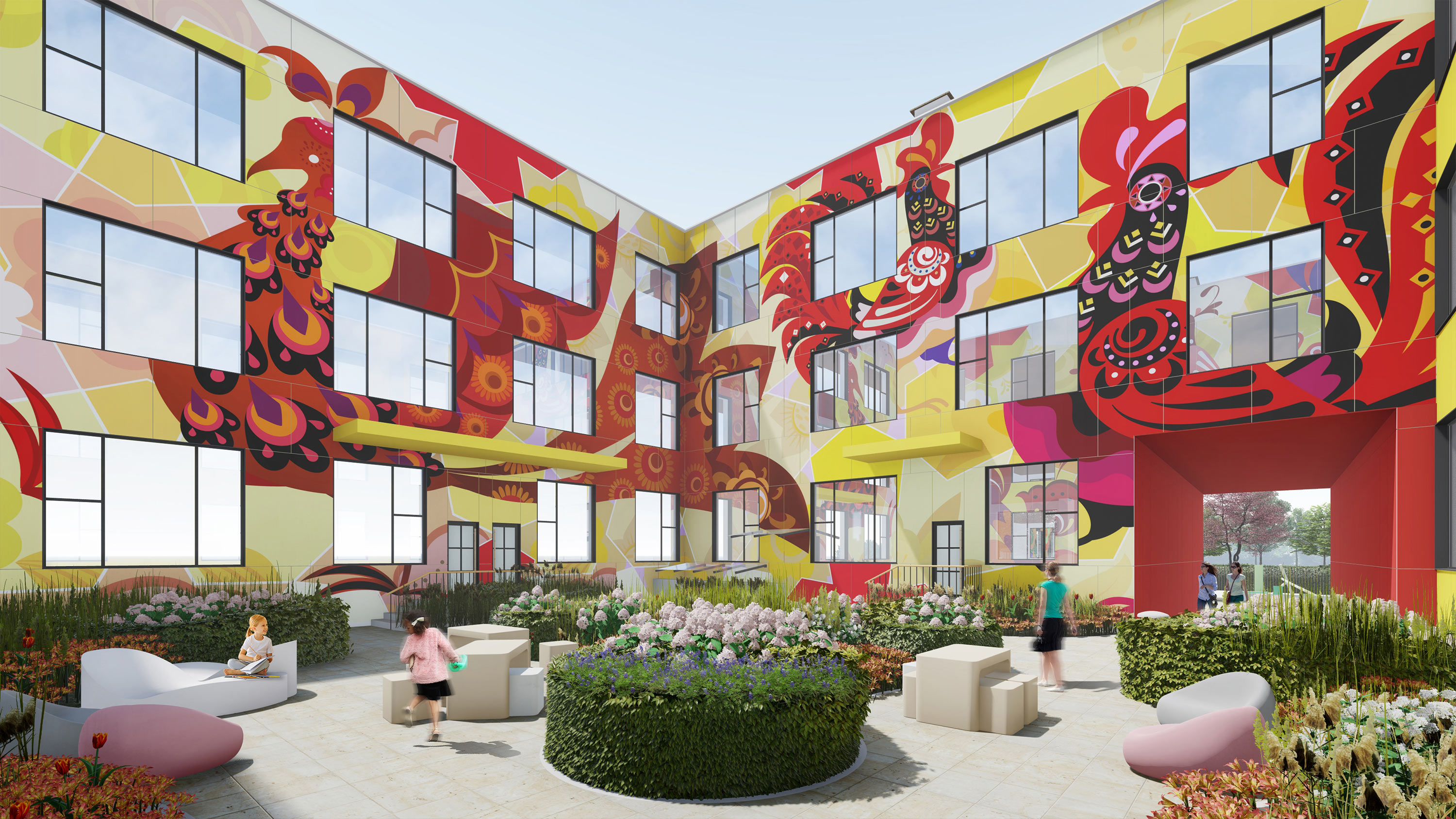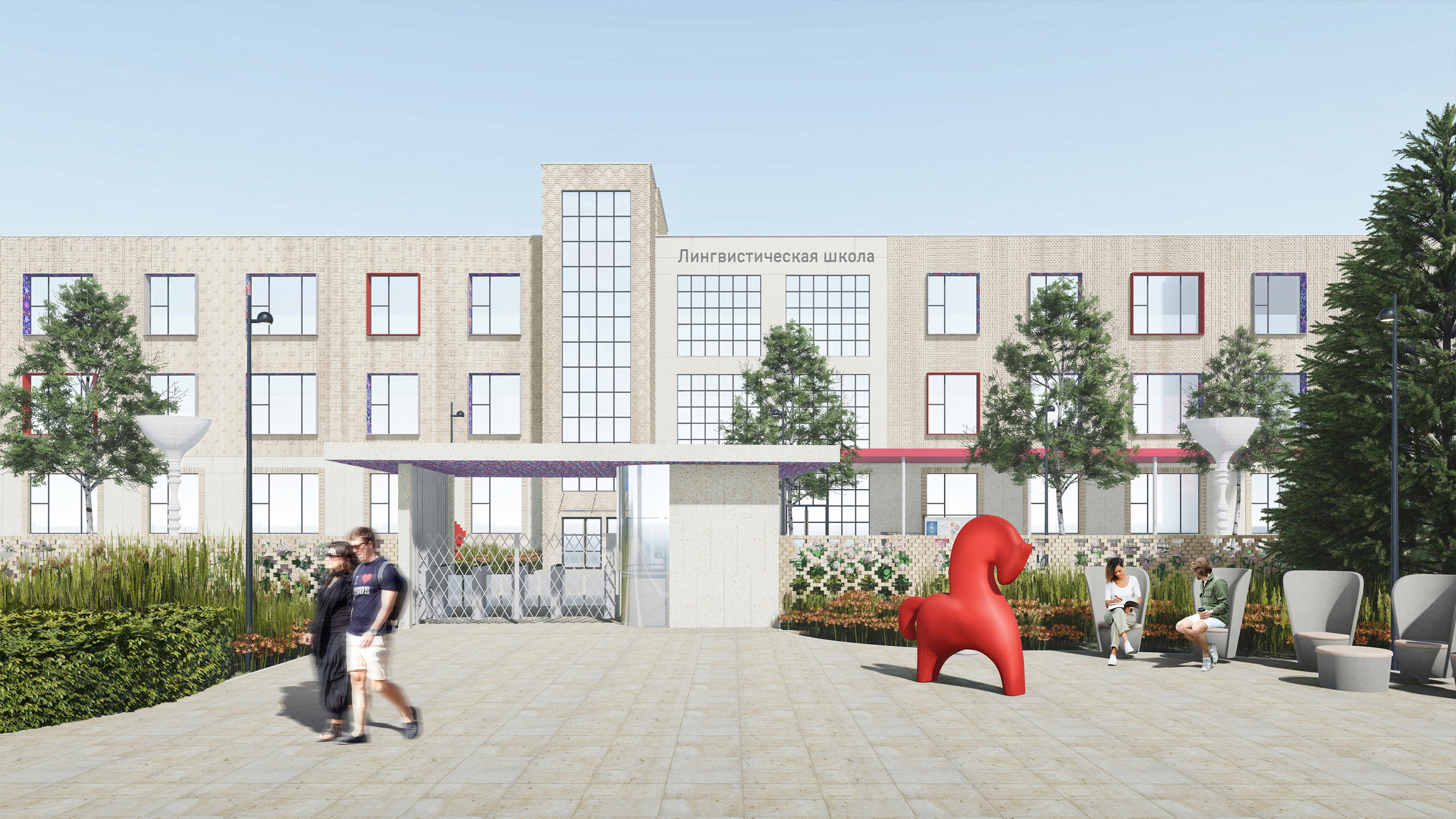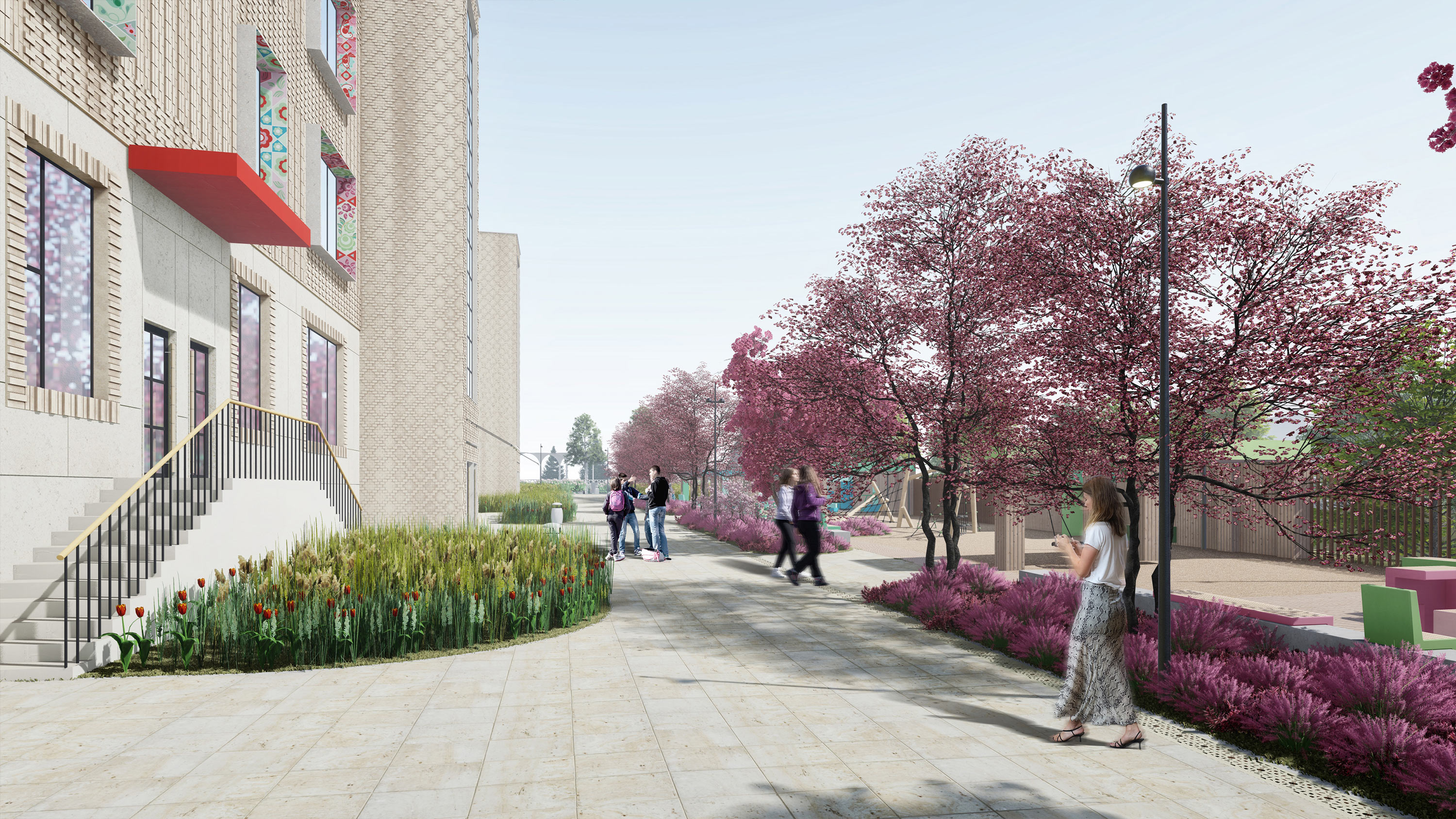 Landscaping solution for the surroundings of the new Russian secondary school that opened in Dushanbe in the fall of 2022 was created in the studio. It further develops the solutions of the façades and interiors and fits well with the new architecture.