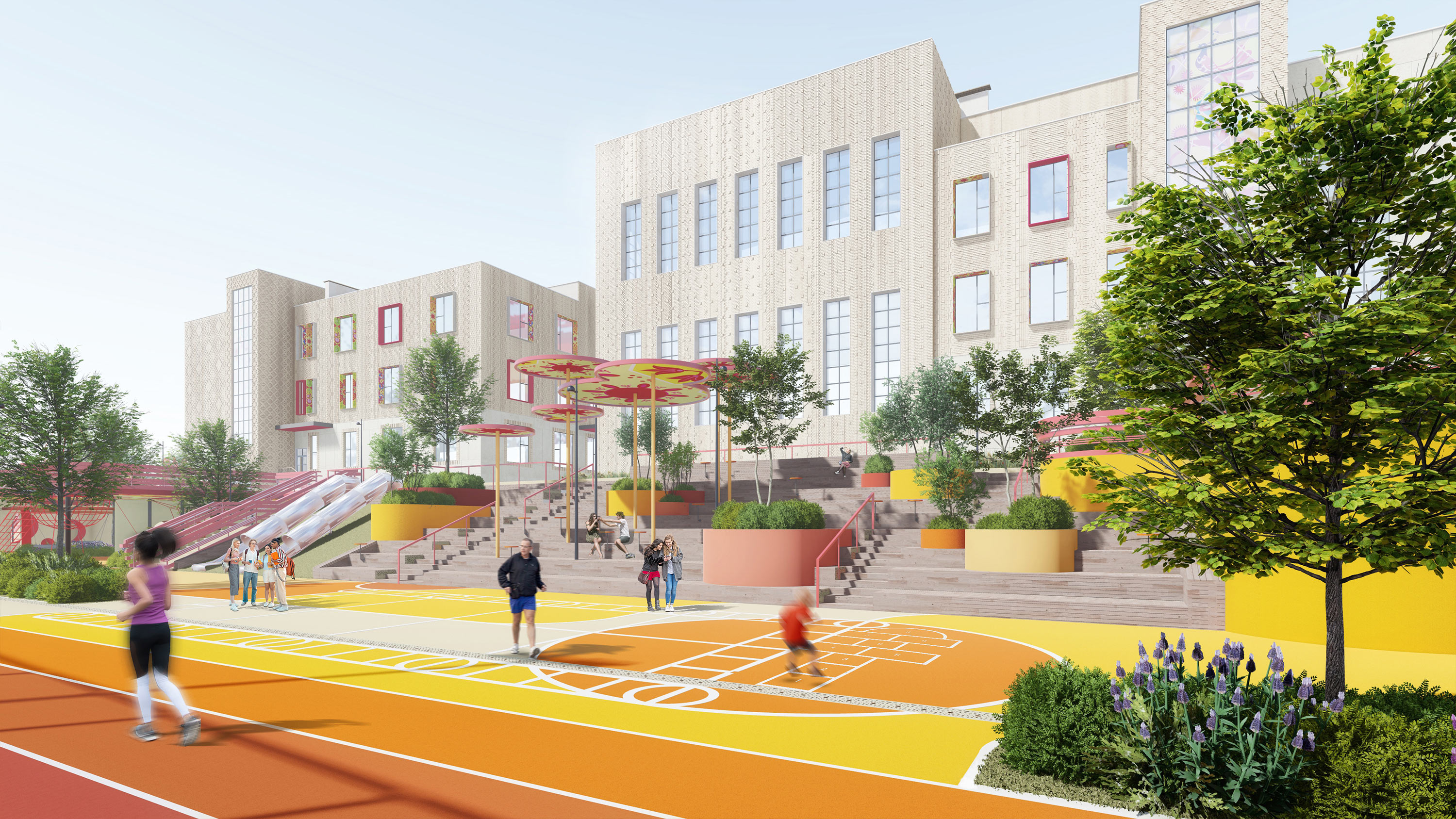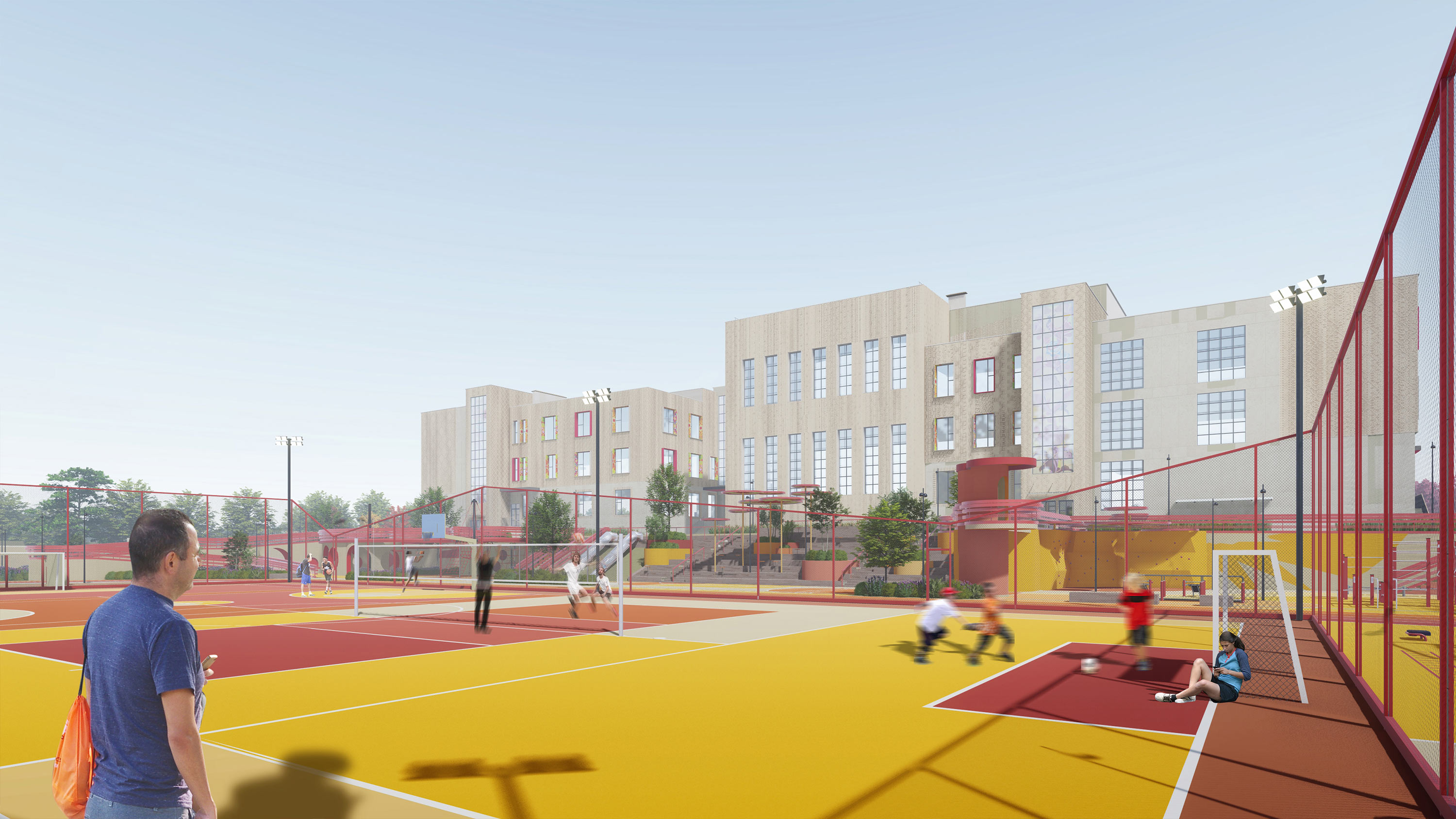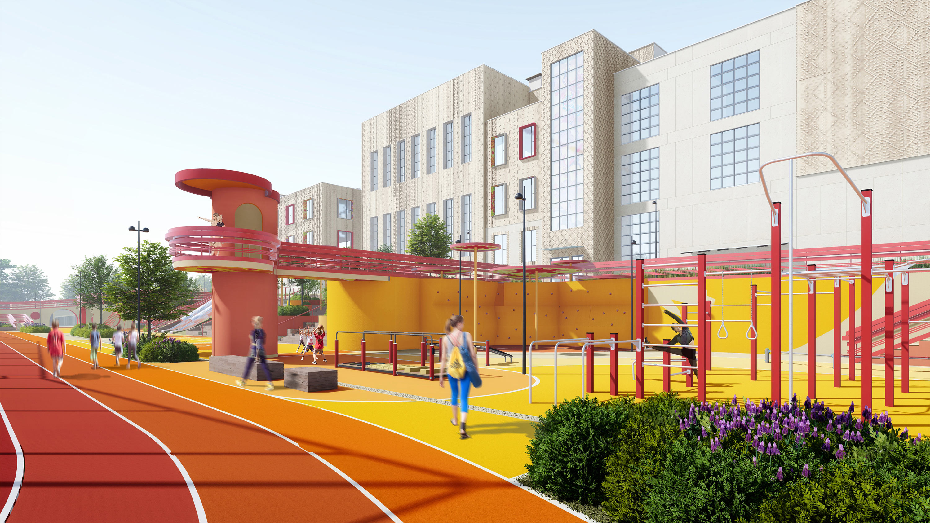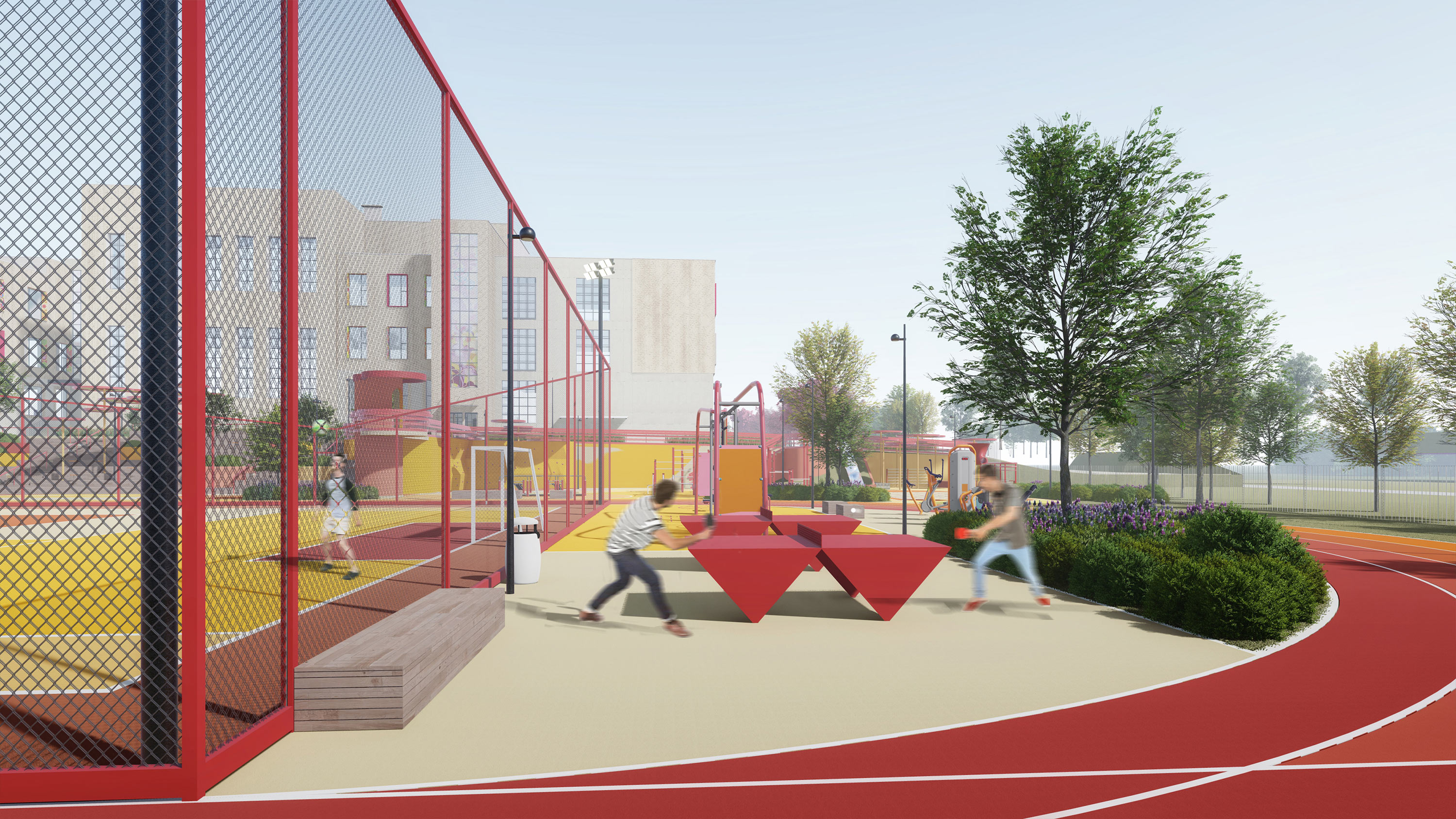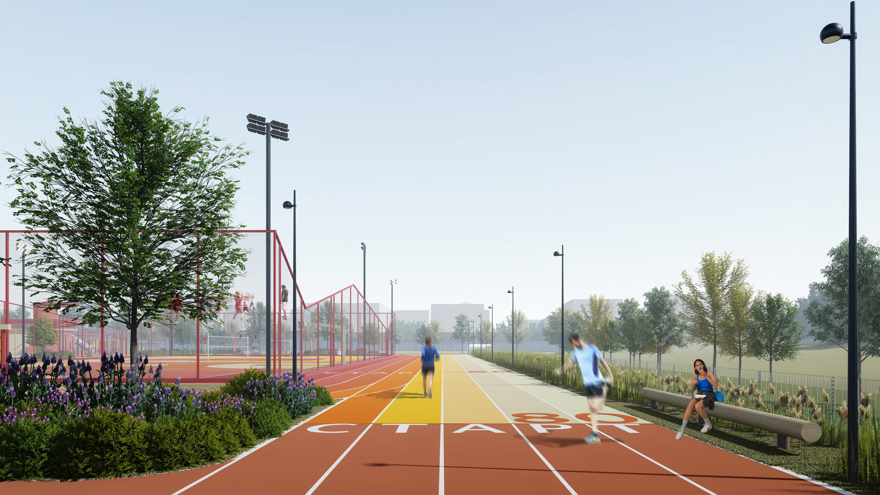 The sports core is the stadium with a running track, soccer, basketball and volleyball fields, gymnastic fields, long jump and high jump pits, as well as rock climbing and workout zones.