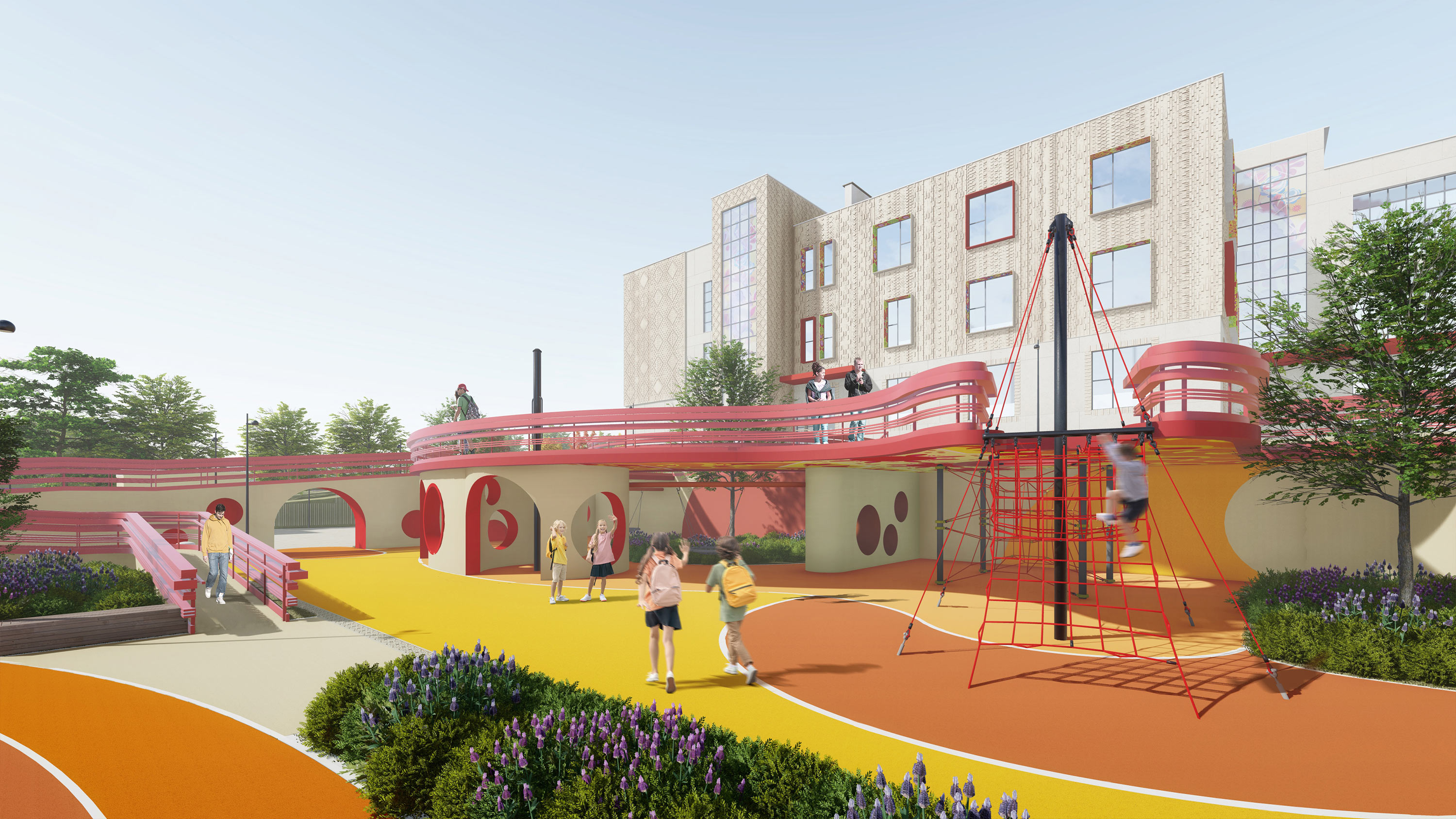 A combined play space designed for different age groups of the elementary school helps children find their own way and make new acquaintances.