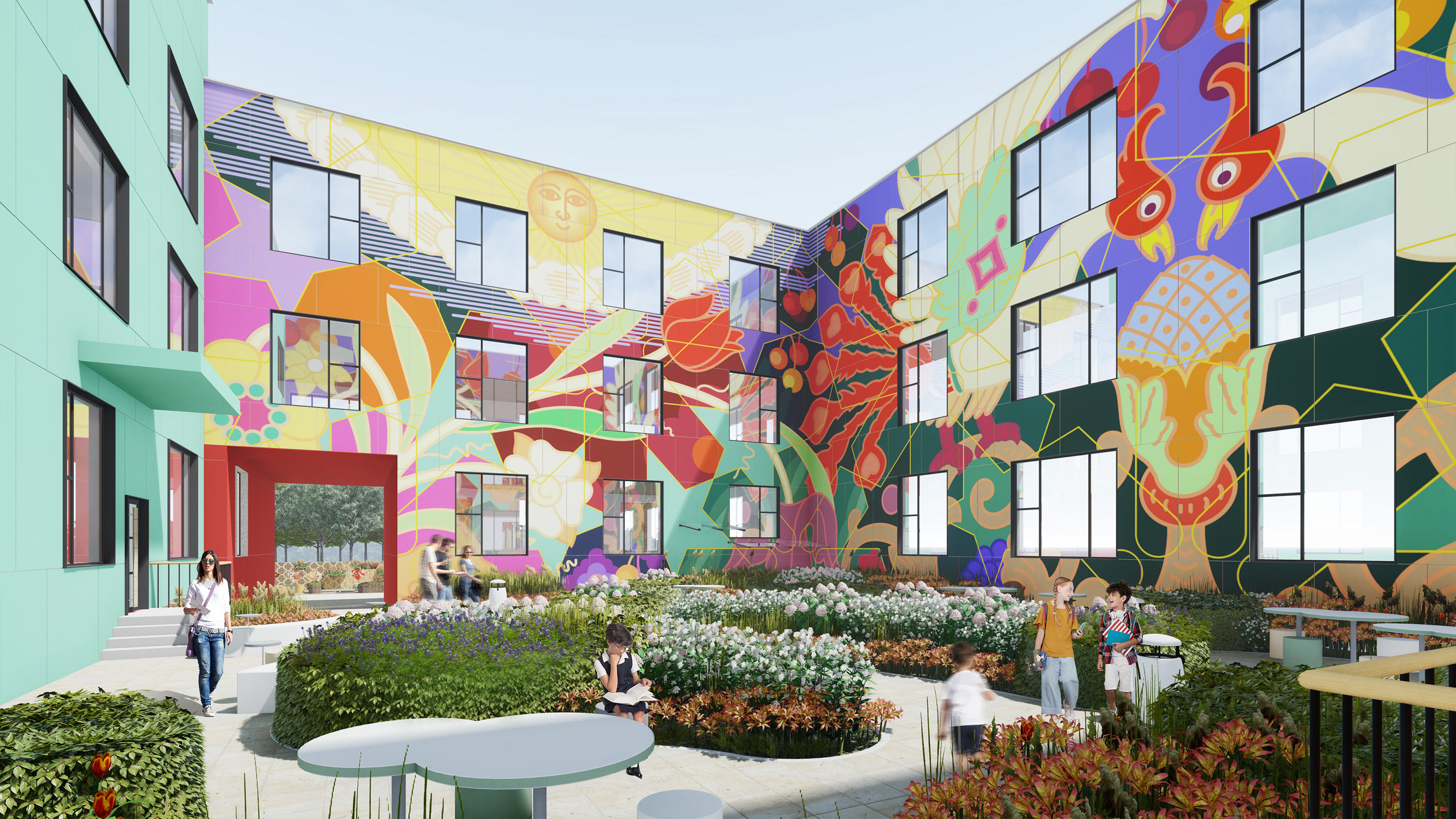 The school’s landscaping creates a unique space with a recognizable design code.