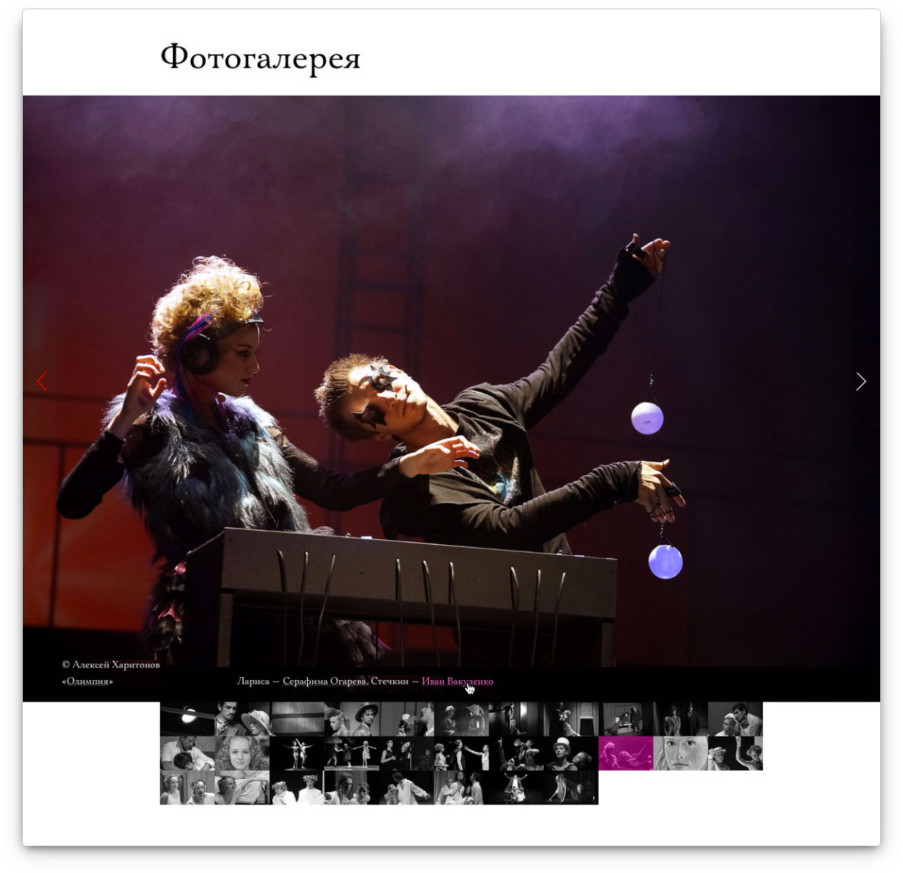 The photo gallery on actors’ pages is used as a navigation element. It can take to the page of the performance shown on the photo or the page of a different actor who also appears in the picture.