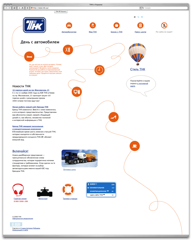 TNK is one of Ukraines most popular fuel brands. The website was painted the colors of the companys new corporate identity that was introduced in spring 2006. ![]() Car route with stationscorporate orange dots
