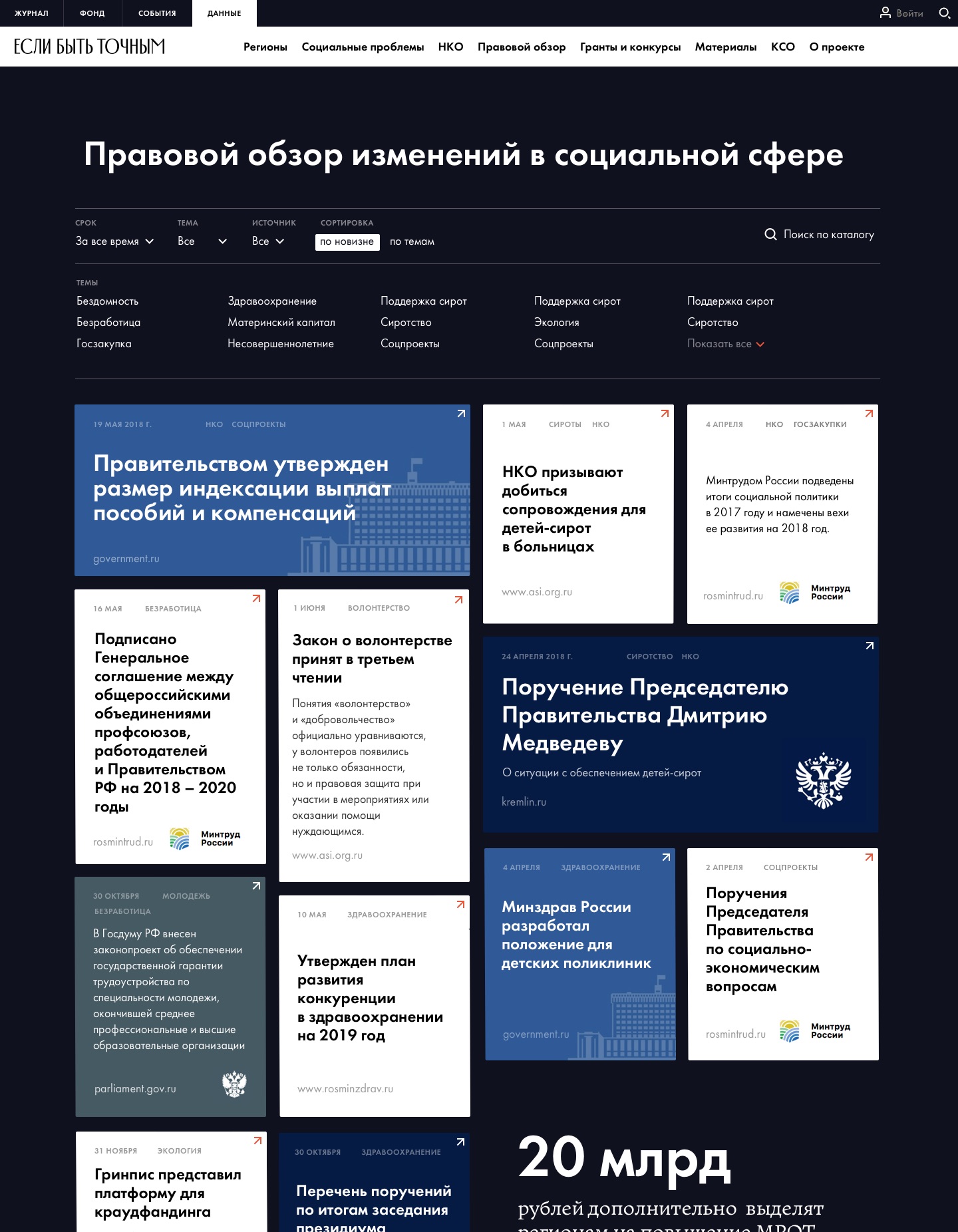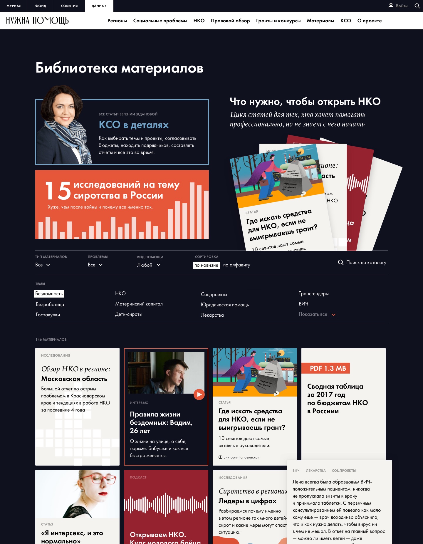 The website contains a huge amount of materials from various sources that help organizers, non-profit organization employees, researchers and journalists. Legal advice, valuable experience of other charitable organizations and research. All materials have been selected and curated by the project team and cards have been created for each type of content.