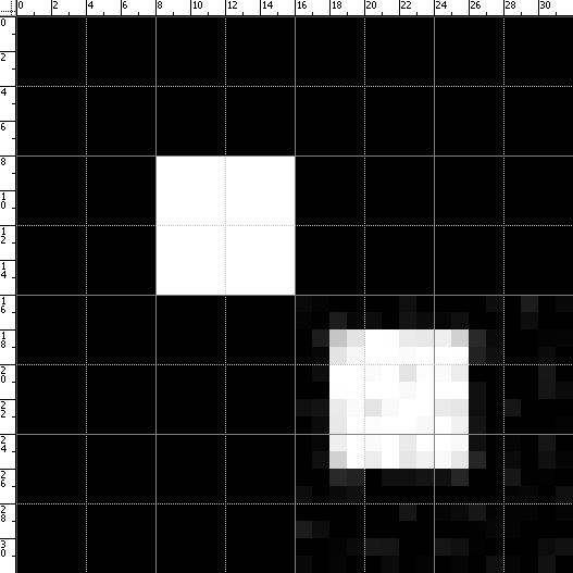 Both white square are of the same size which is 8×8 pixels. The first one is aligned with the grid, whereas the second one is 2 pixels off to the right and to the bottom.