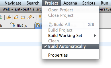 Now we can run the builder by choosing Project → Build Project (you can also assign a shortcut). And if we choose Project → Build Automatically, we wouldn’t have to do anything as the project will be built each time a file is modified.