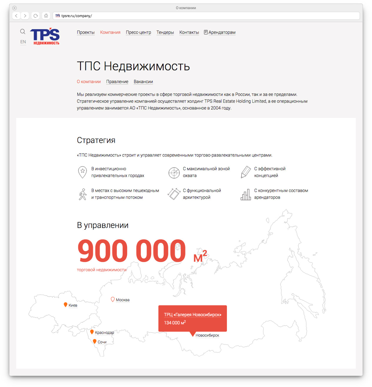 Since 2004, TPS Real Estate has been engaged in designing and building large shopping and entertainment centres in Russia and Ukraine. A website with information about the company and its projects was created at the studio.
