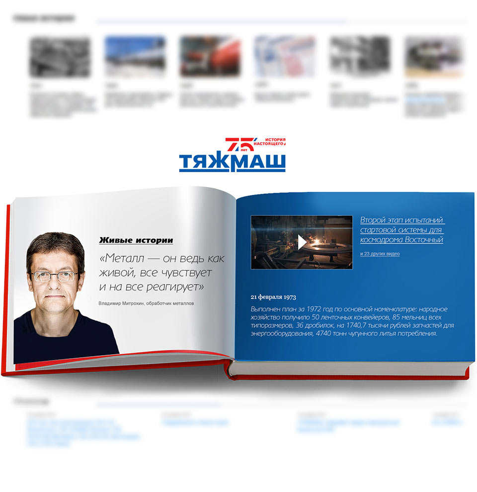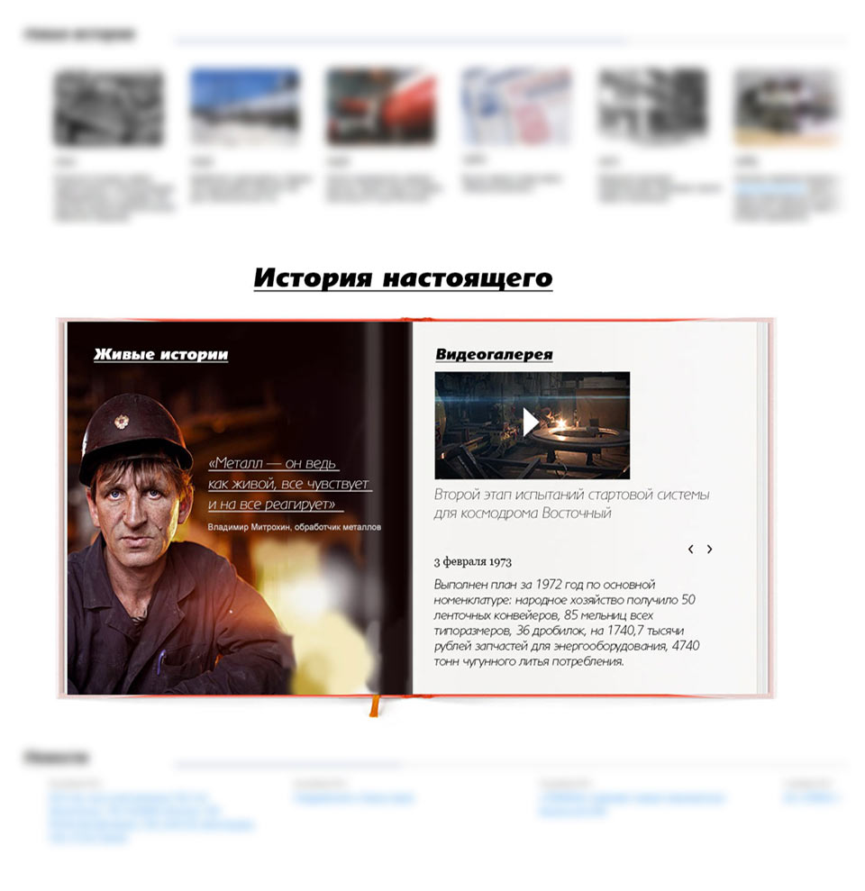 Making the first approach to the block on the main page and the new section. There are plans to publish a book for the anniversary, so we decide to design the block as a book as well.