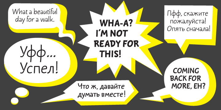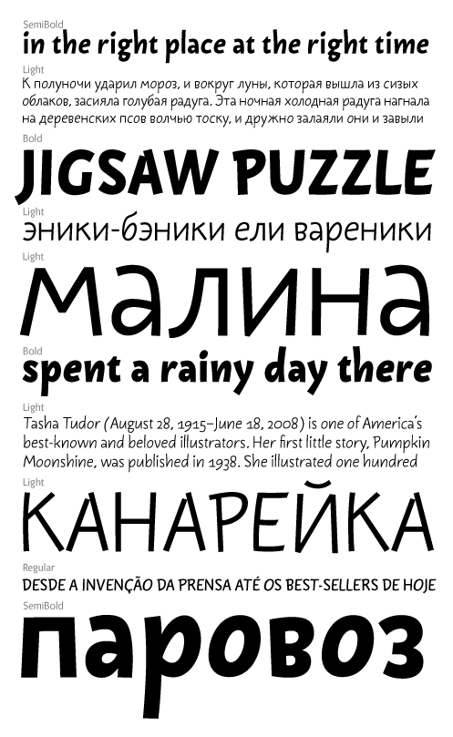 Dereza is a grotesque typeface designed specially for display use in children’s books and magazines. Books for little ones are usually set in grotesques, and a vigorous font would make a nice addition to the main face. Playful and lively, Dereza is great for any non-grown-up design such as games and toy boxes, cookie jars and cereal packs, clothing labels and other things meant for kids. It looks super in speech bubbles.