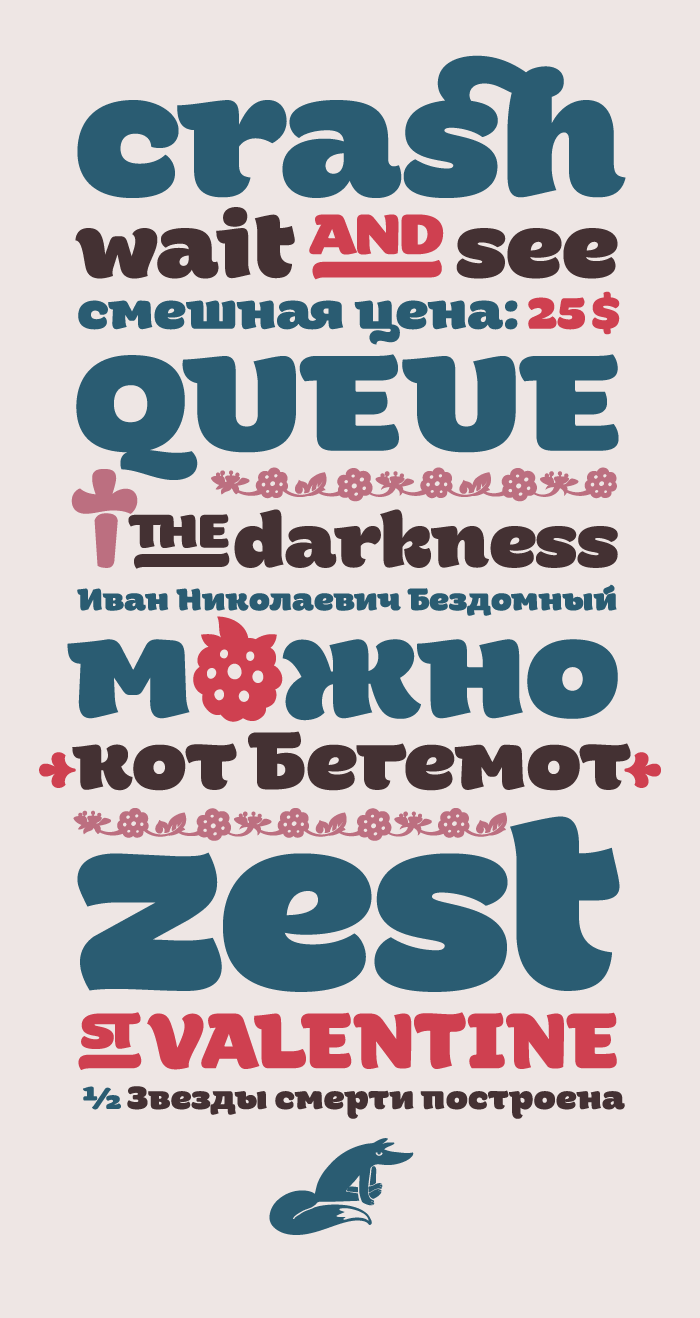 Malina works wonders in titles and bite-size text nuggets. On top of the regular set of characters, the typeface hosts with ease a duck and fox, owl and crocodile, mammoth and pig. They’re irresistible when used by one or in bunches forming patterns. The typeface is ideal for signs, posters, sweets and kids product packaging; will feel at home in fun & entertainment stuff design and as a part of playful projects.