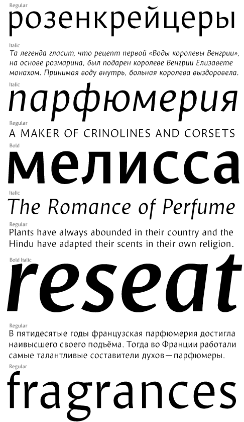 Mezzo is a slender, humanist sans serif with four font styles. Designers will find it useful when creating packaging, candy and pastry wrappers, perfume and wine labels, etc. Slim and elegant letterforms are especially fit for small pieces of text, headings and subheads.