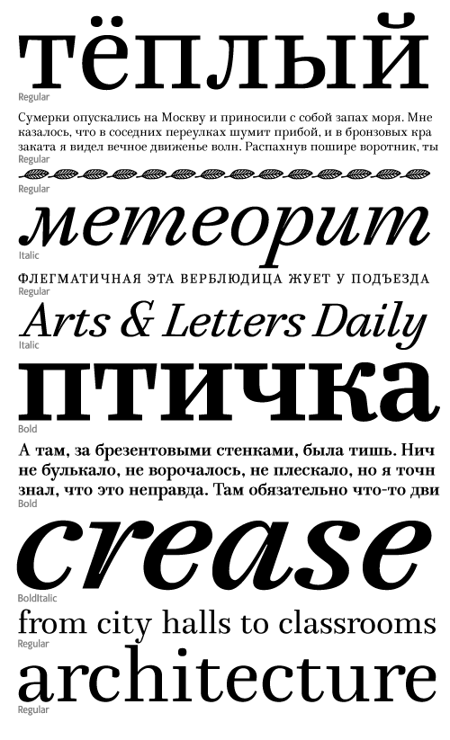 Mirta is a clean text type well-suited for use in typesetting of smart volumes and kids books. Fine and well-balanced antiqua face is complemented by surprisingly vigorous sophisticated italics.