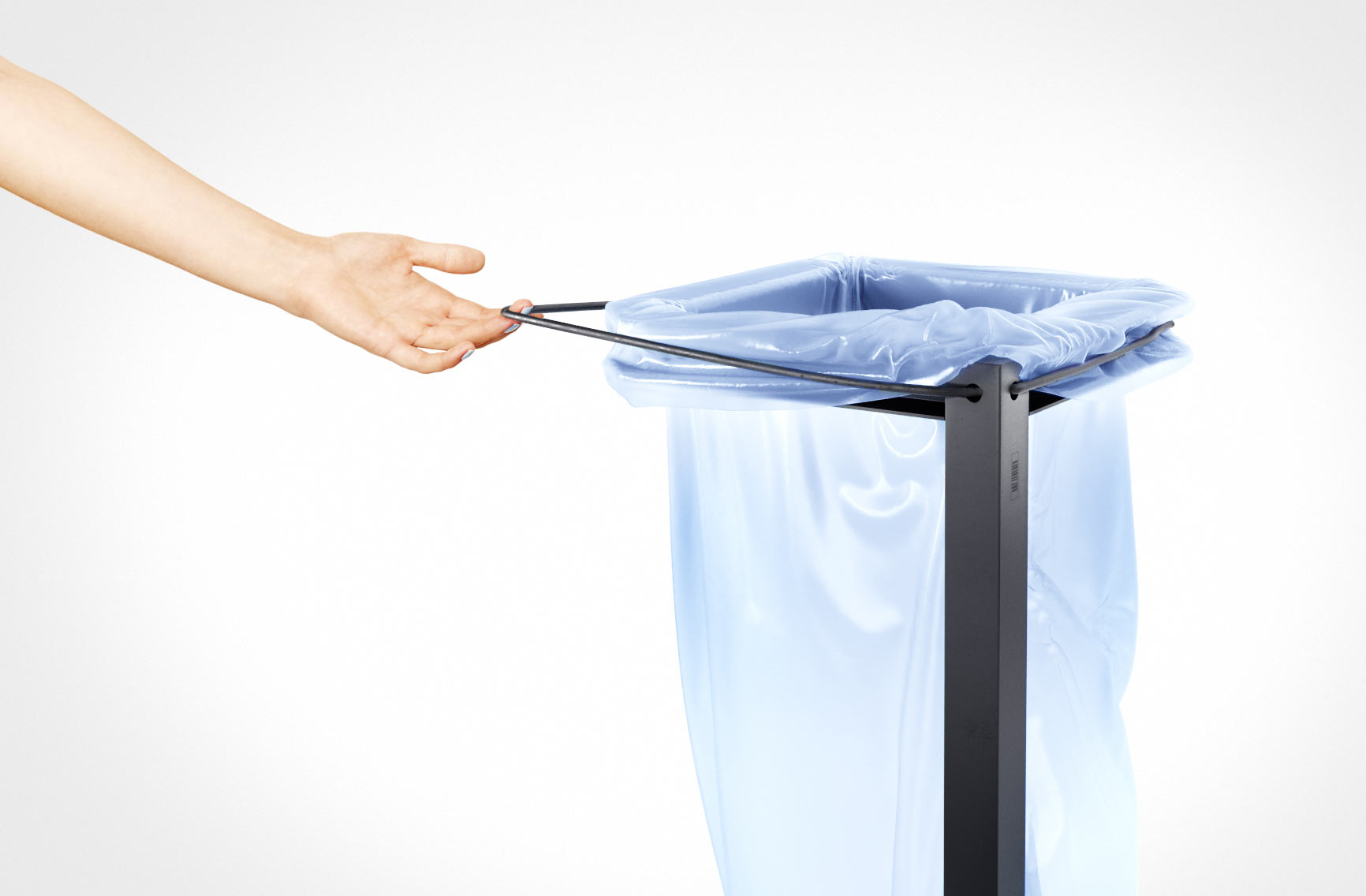 The trash can requires a fairly strong trash bag that is held in place with a special rubber band. The cut-off angles prevent damage to the bag and make the trash can safe for people passing by. Urnus-14 does not require additional buckets or daily cleaning except for replacing the trash bag