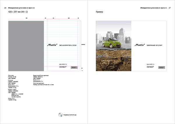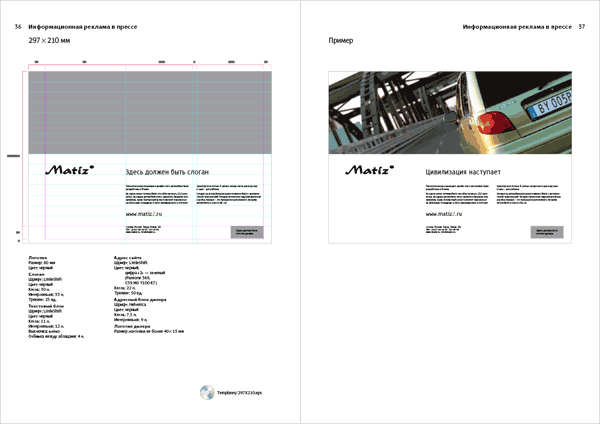 The guidelines are intended for design studios and advertising agencies involved in preparation, production, composition and printing of Matiz advertising materials. ![]() ![]() ![]() |