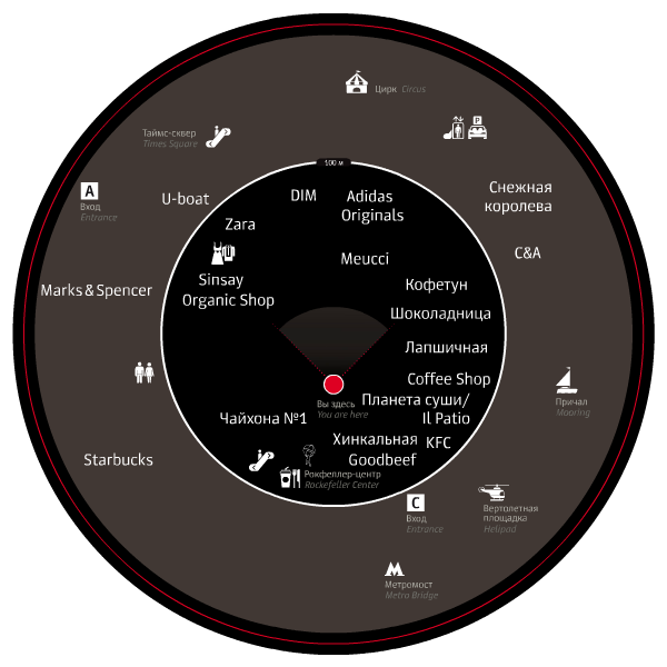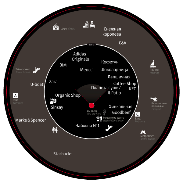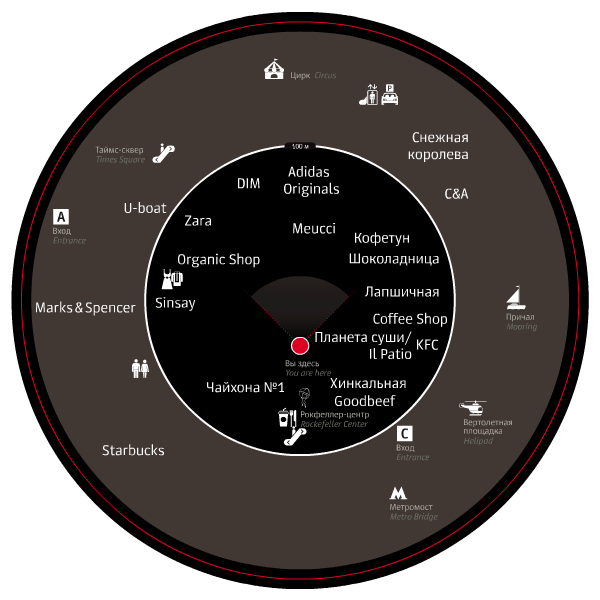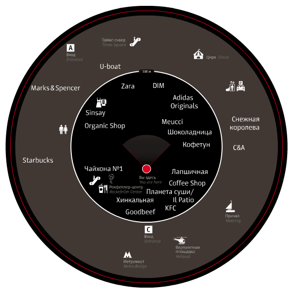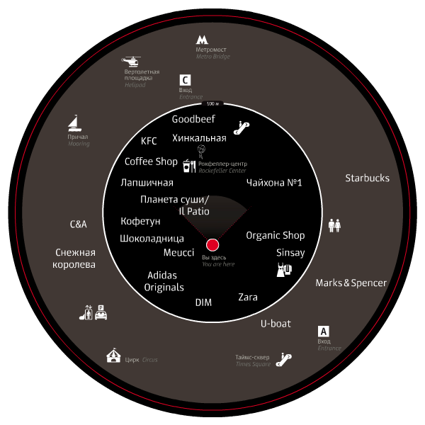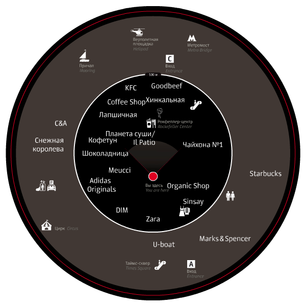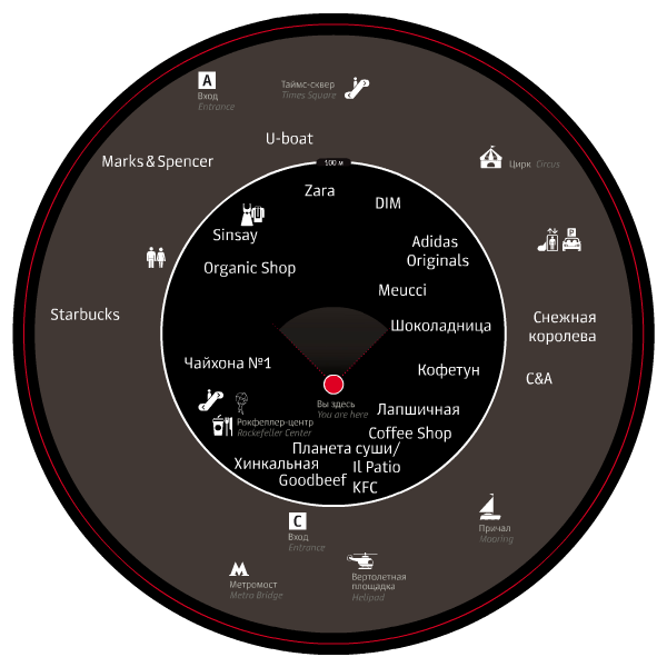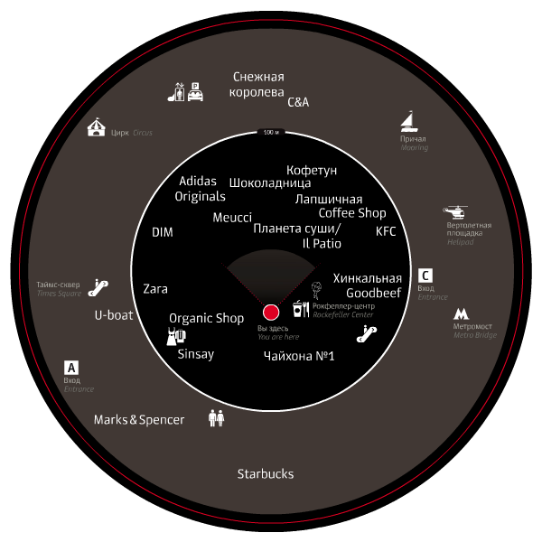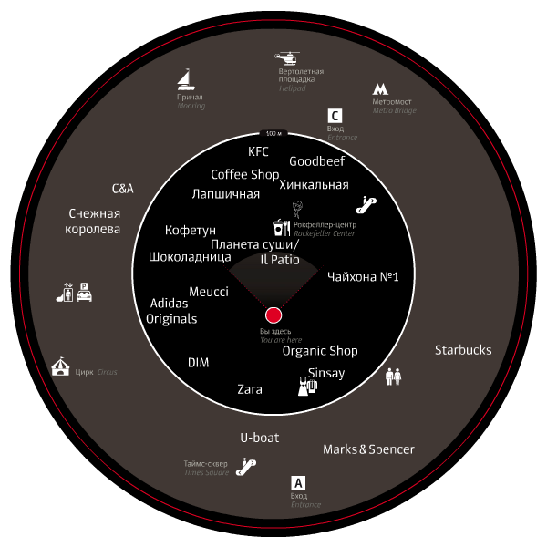 Vegas Crocus City is a large shopping center designed and decorated in the spirit of New York. The mall is divided into themed zones named after famous New York City landmarks: Times Square, Madison Avenue, 47th Street and Rockefeller Center. The shopping center includes more than 500 stores on five levels, an entertainment zone, an ice rink, a children’s entertainment center, a multiplex cinema, a bowling alley, cafés and restaurants. A full-scale navigation system was developed at the studio to help visitors find their way around the shopping center and the surrounding area.