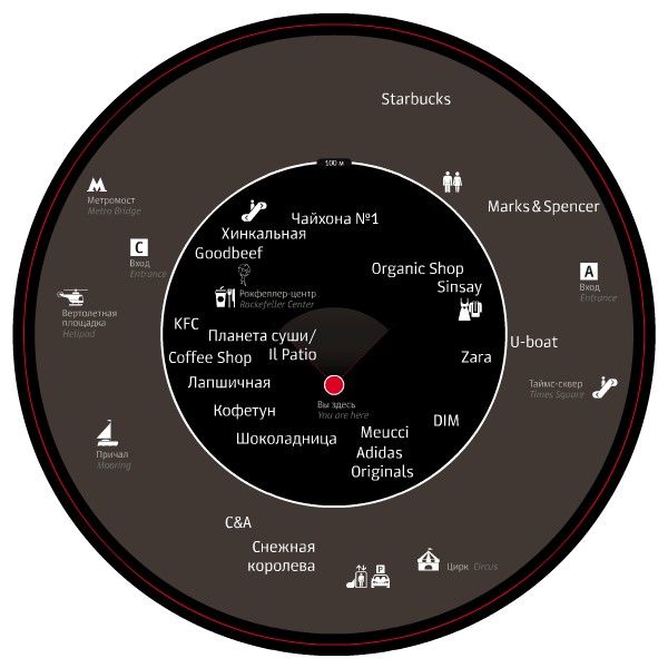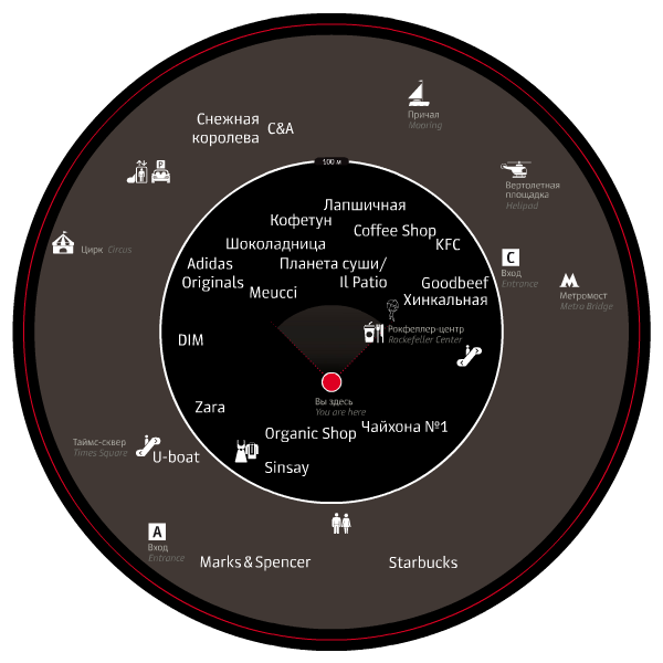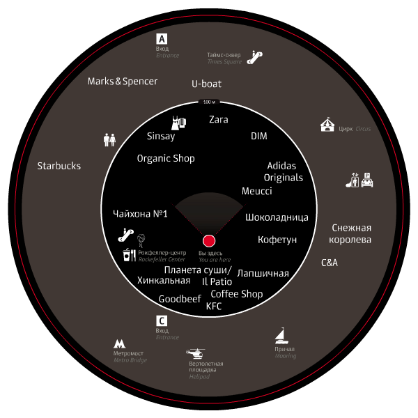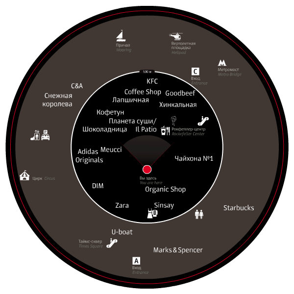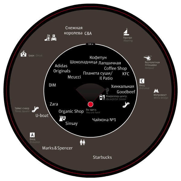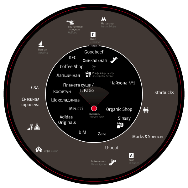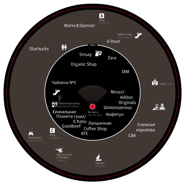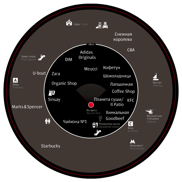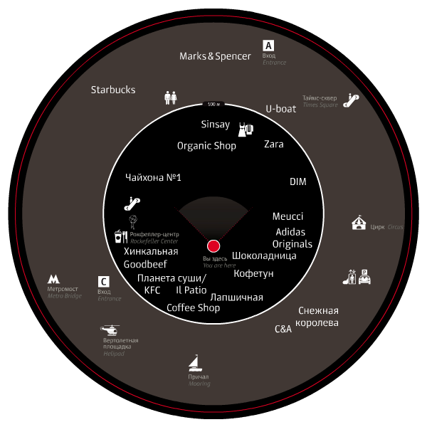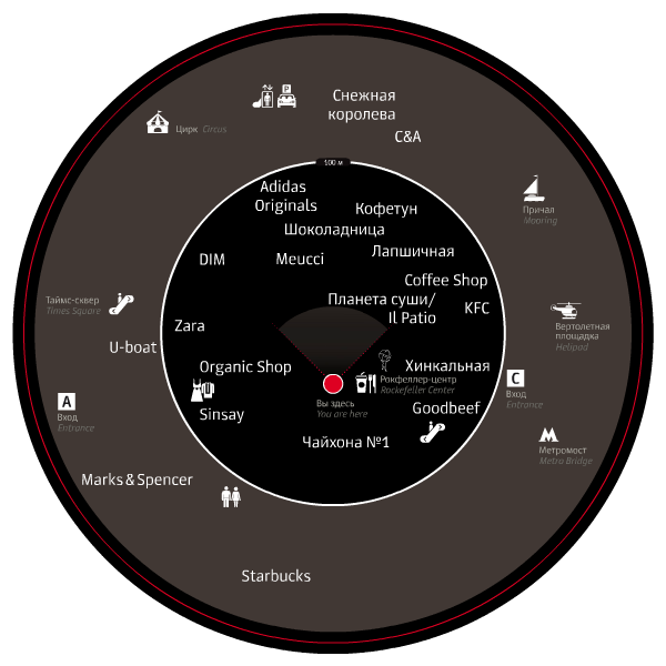 Vegas Crocus City is a large shopping center designed and decorated in the spirit of New York. The mall is divided into themed zones named after famous New York City landmarks: Times Square, Madison Avenue, 47th Street and Rockefeller Center. The shopping center includes more than 500 stores on five levels, an entertainment zone, an ice rink, a children’s entertainment center, a multiplex cinema, a bowling alley, cafés and restaurants. A full-scale navigation system was developed at the studio to help visitors find their way around the shopping center and the surrounding area.