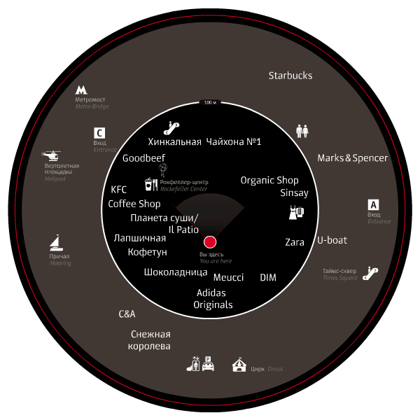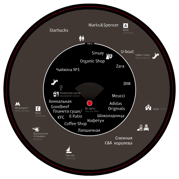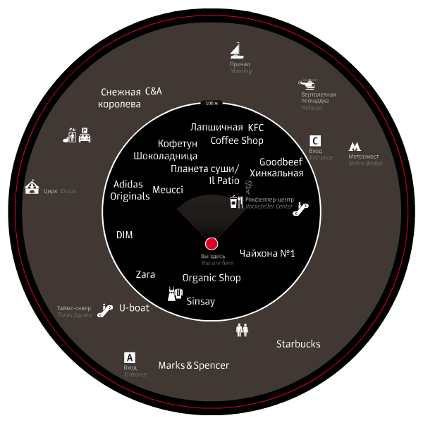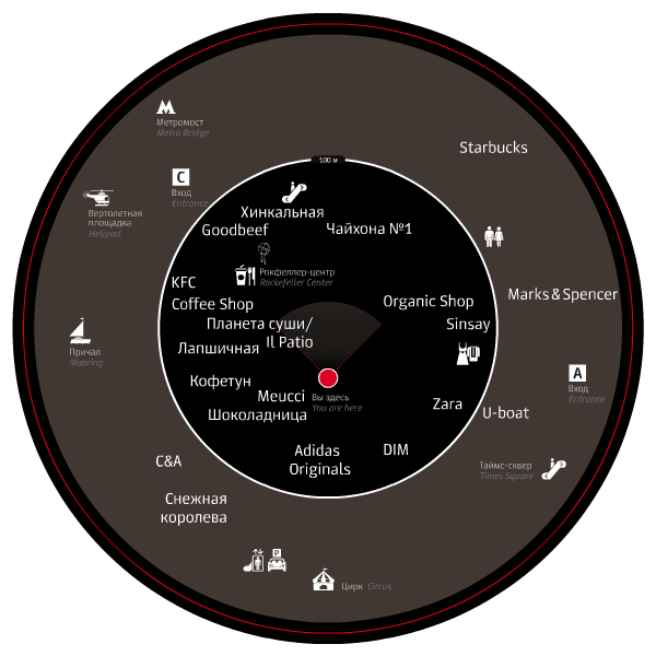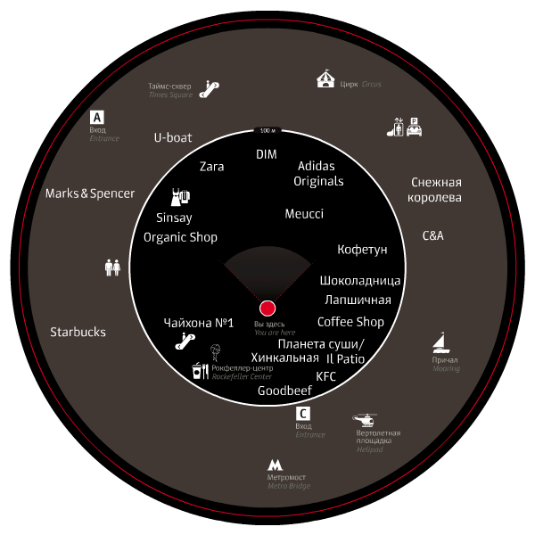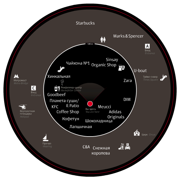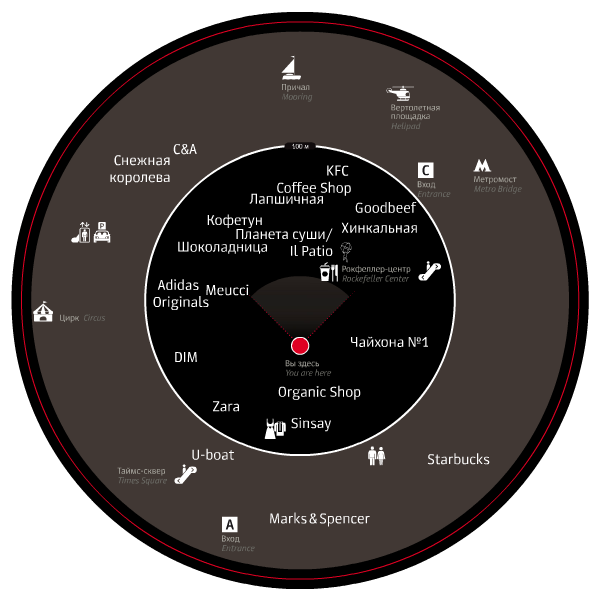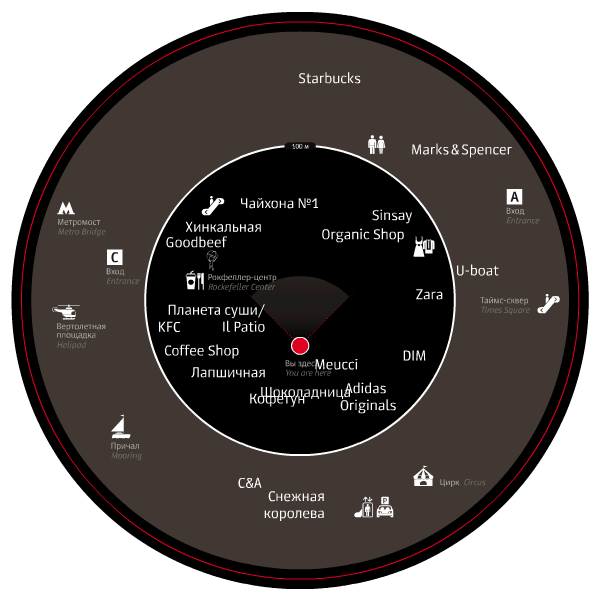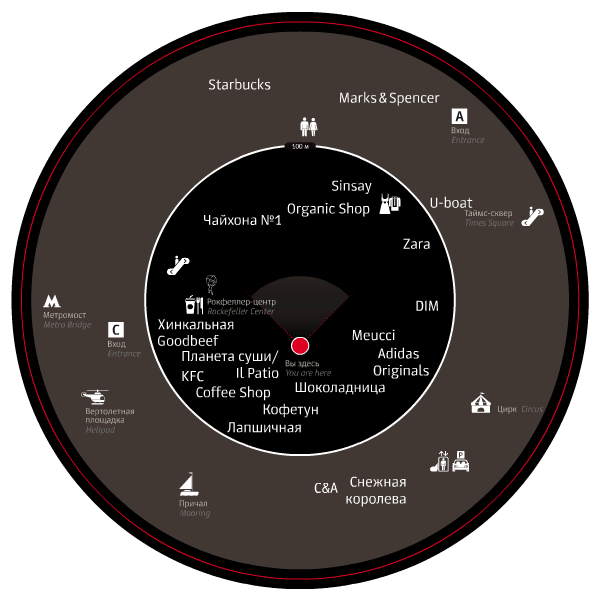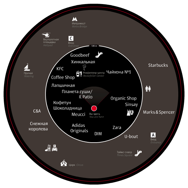 The main navigation is supplemented by the radar which allows visitors to orientate themselves intuitively. The content of radar stands changes according to their position and surroundings. A small number of key stores shown allows users to read information quickly without spending too much time at the stand.