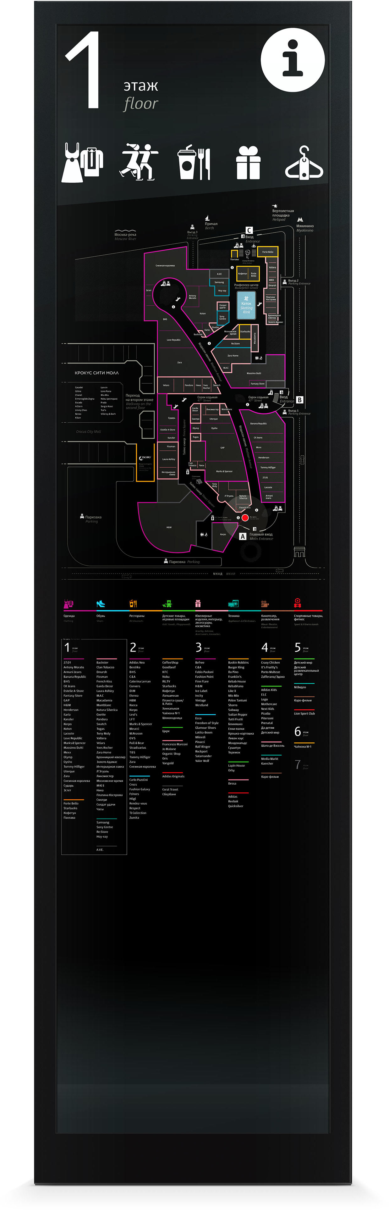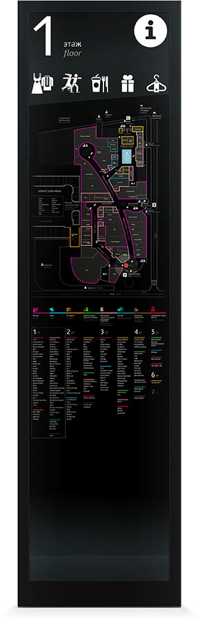 The main navigation stand on each floor displays the floor number, a list of categories of goods and services decorated with large and clear pictograms, a detailed map of stores and exits and a “You are here” marker. The bottom part of the stand has a list of all stores in Vegas along with their category and floor number.