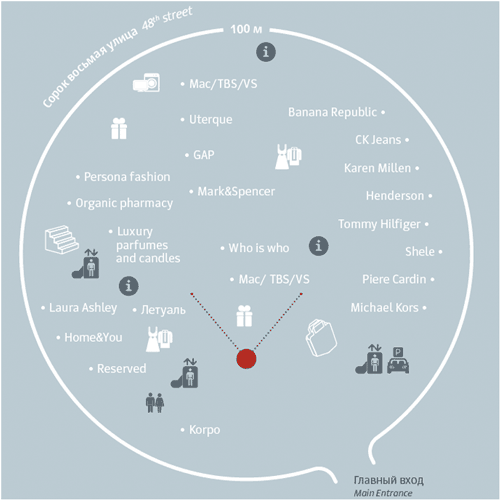 Seeing the entire mall from inside gives us a temptation to make everything simpler. The space already looks familiar and understandable. It’s important to see the space the way it is seen by a person who comes to Vegas for the first time. Some prefer using a map, others like hanging signs. Younger visitors will enjoy using the radar.