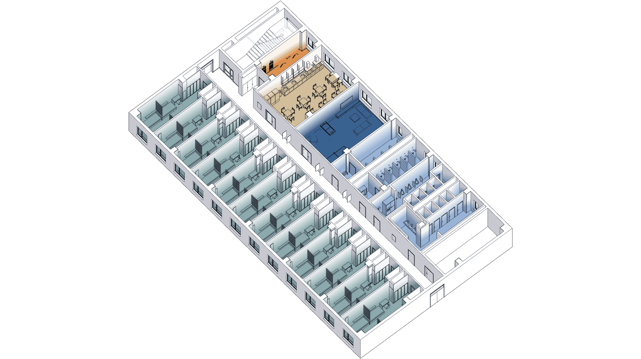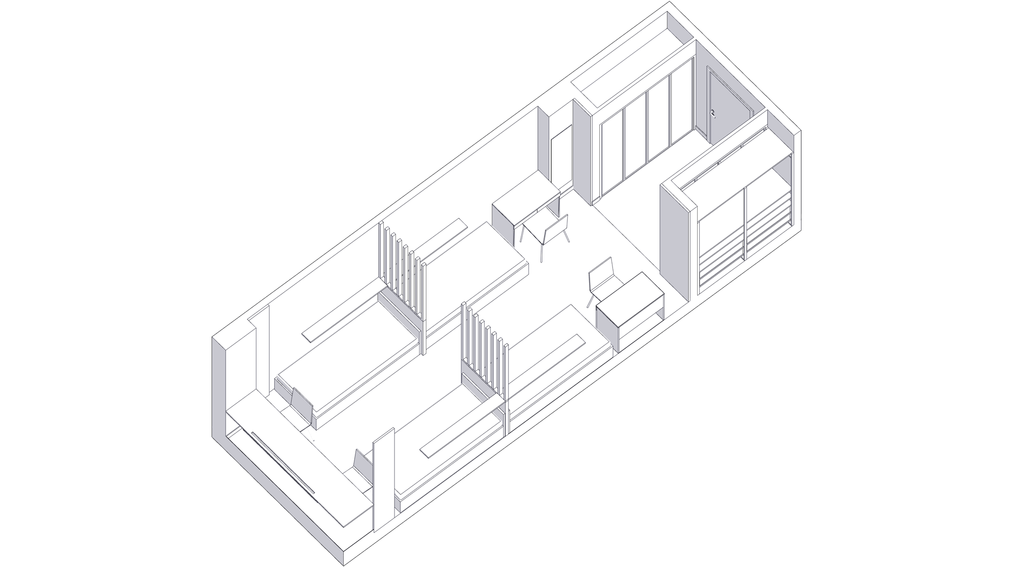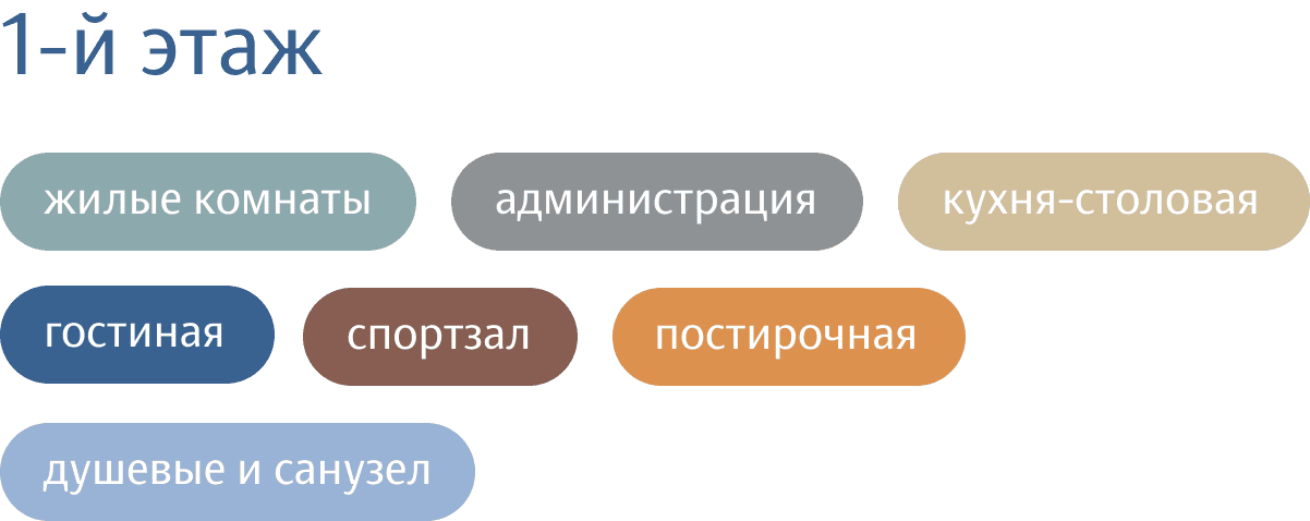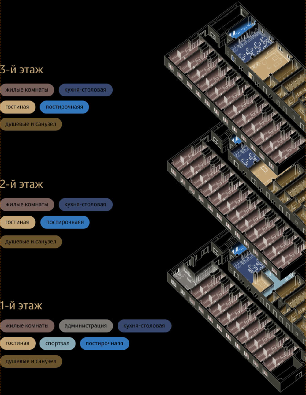 To ensure that residents feel comfortable sharing a single room, the sleeping areas are zoned using finishes, slatted partitions and local lighting. The rooms are fully furnished with cozy and functional elements: individual compartments for clothes, beds with pull-out drawers for storage, shelves above the beds for personal items with reading lights and small work desks and chairs.