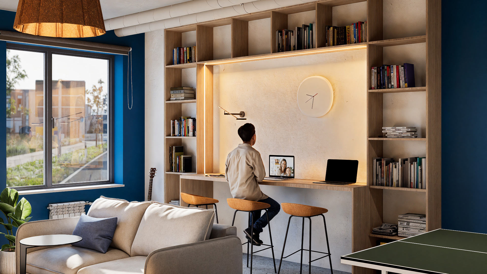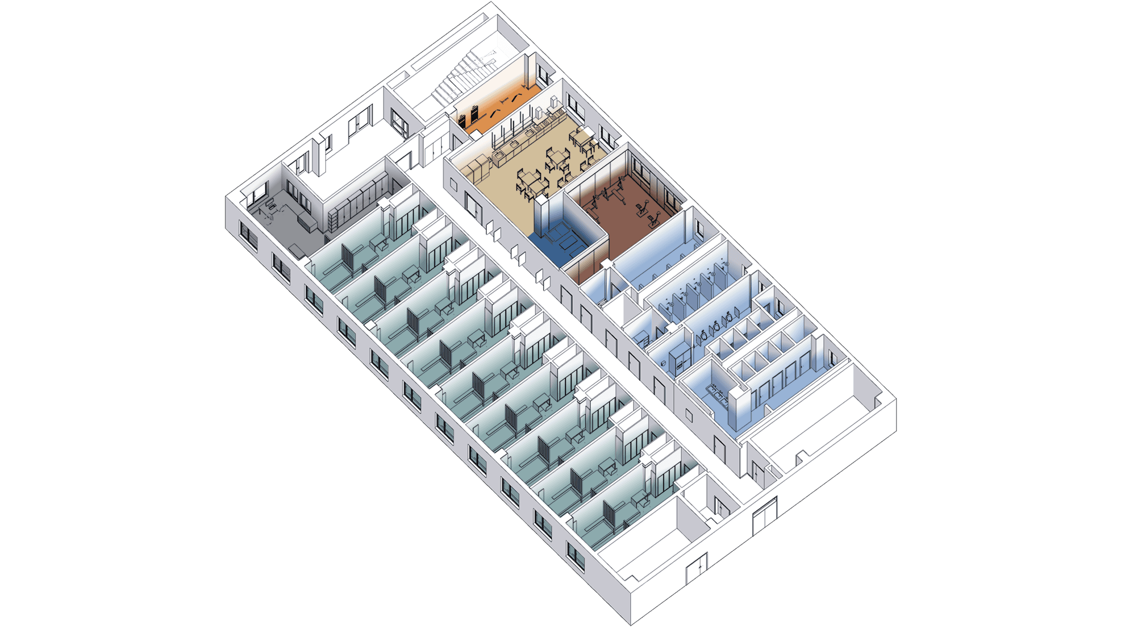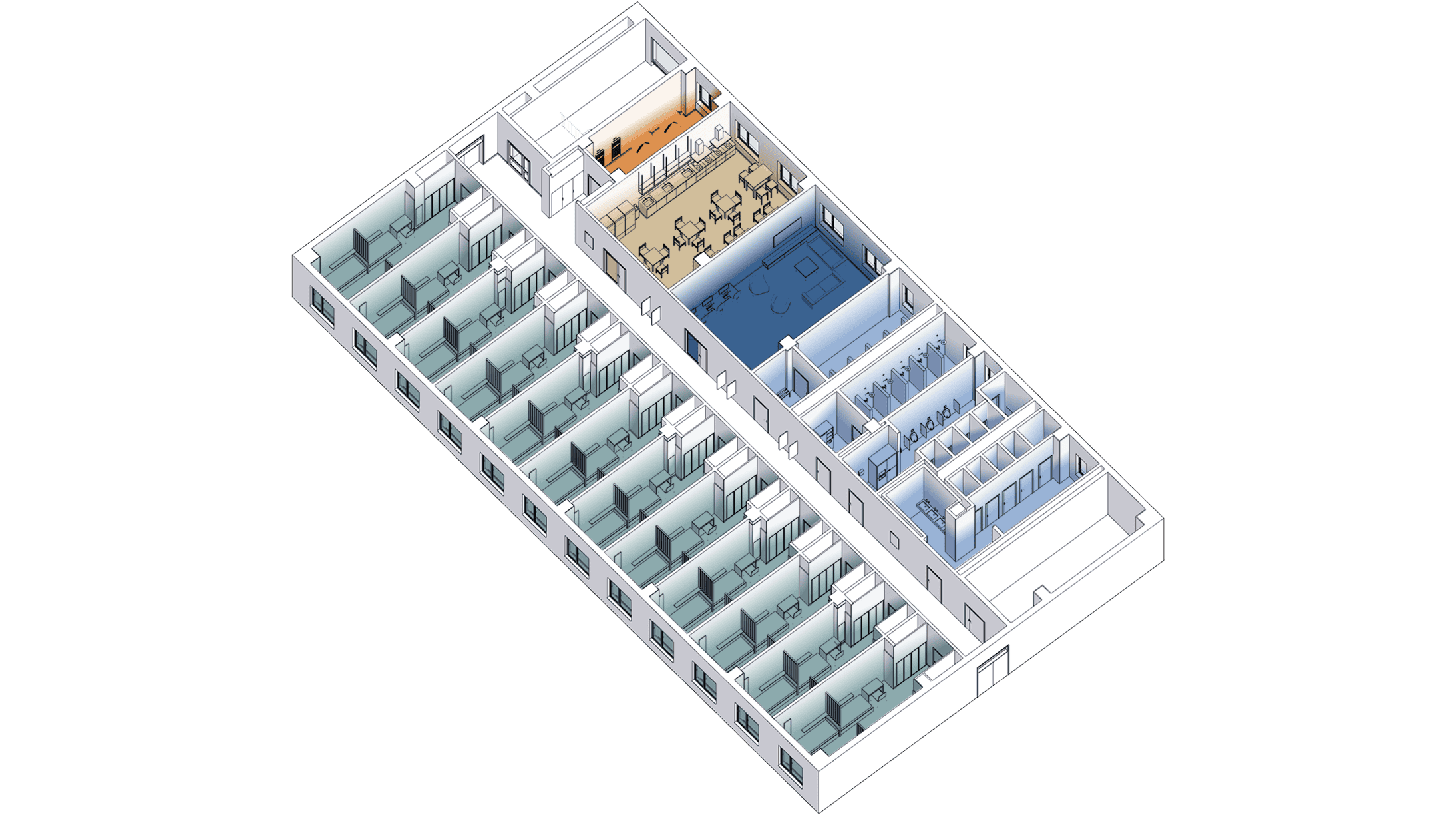 To ensure that residents feel comfortable sharing a single room, the sleeping areas are zoned using finishes, slatted partitions and local lighting. The rooms are fully furnished with cozy and functional elements: individual compartments for clothes, beds with pull-out drawers for storage, shelves above the beds for personal items with reading lights and small work desks and chairs.