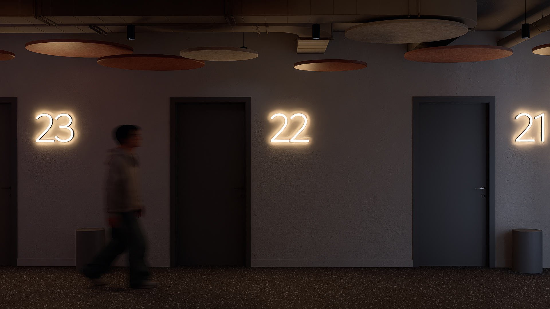 The room numbering uses large illuminated digits, helping employees navigate when returning from their shifts in the evening.