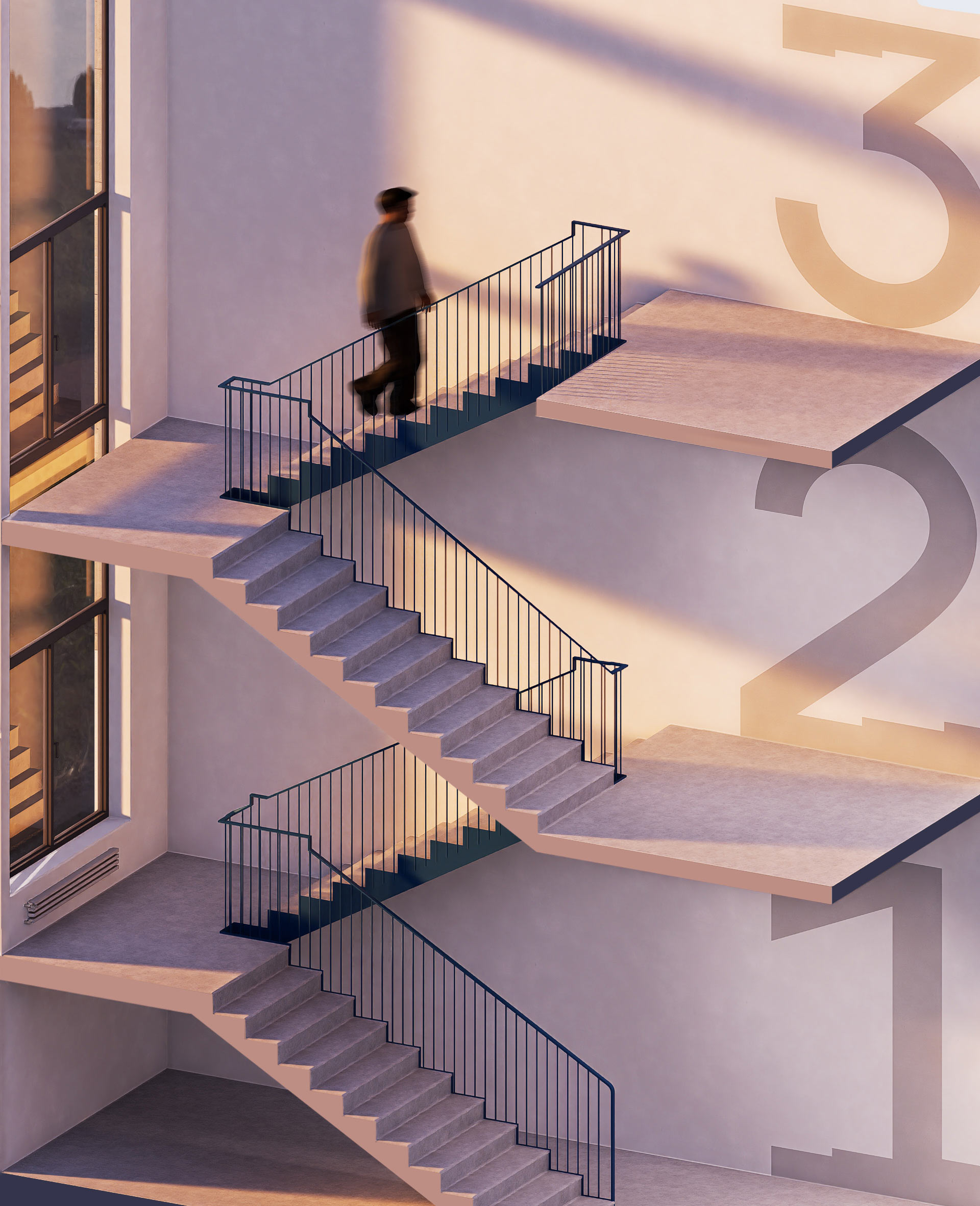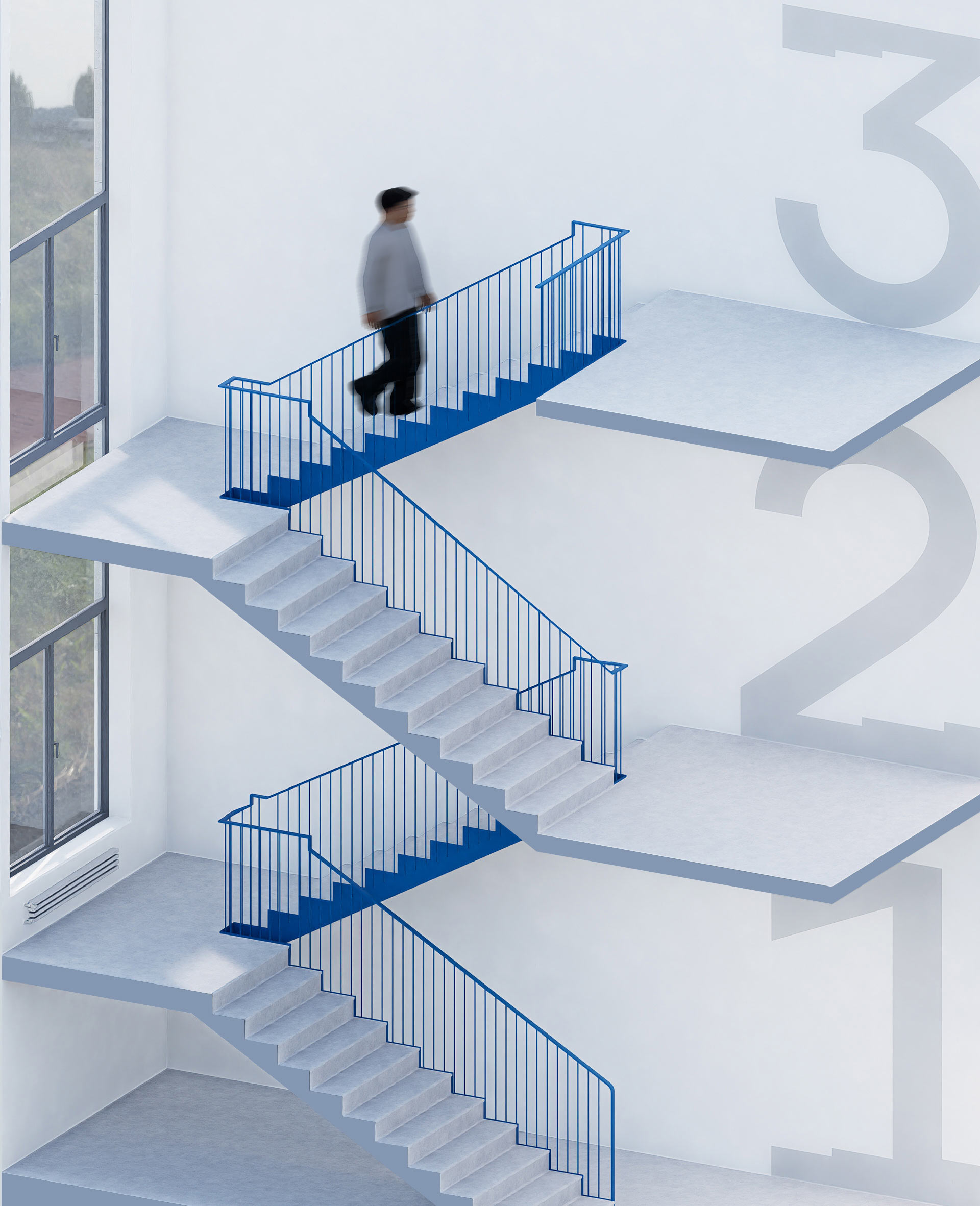 Unique numbers have been designed for the floor numbering. The structure of these digits subtly reflects the main visual theme: the steps. Nearly two-meter high floor numbers rhyme with the contrasting staircases and gently remind employees of career growth.
