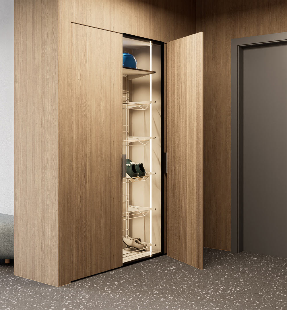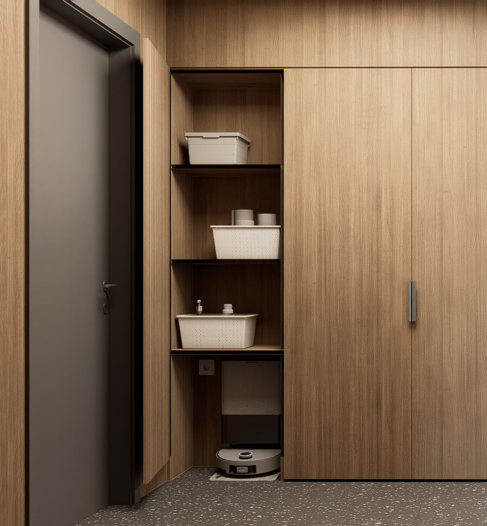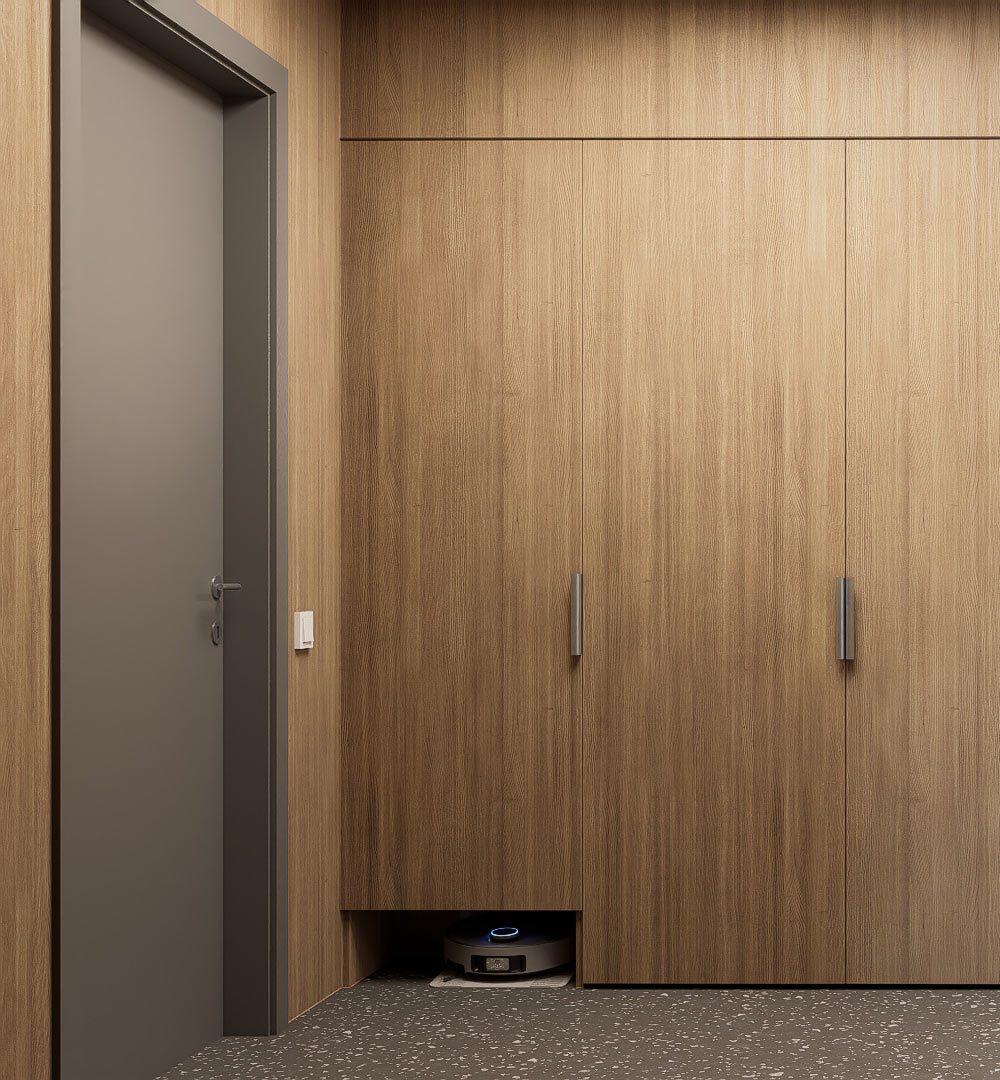 At the entrance to each floor, there is a cabinet for outdoor shoes and household items and even space for a robot vacuum cleaner, which is hidden behind one of the doors. The hallways are equipped with cozy soundproof booths for phone calls.