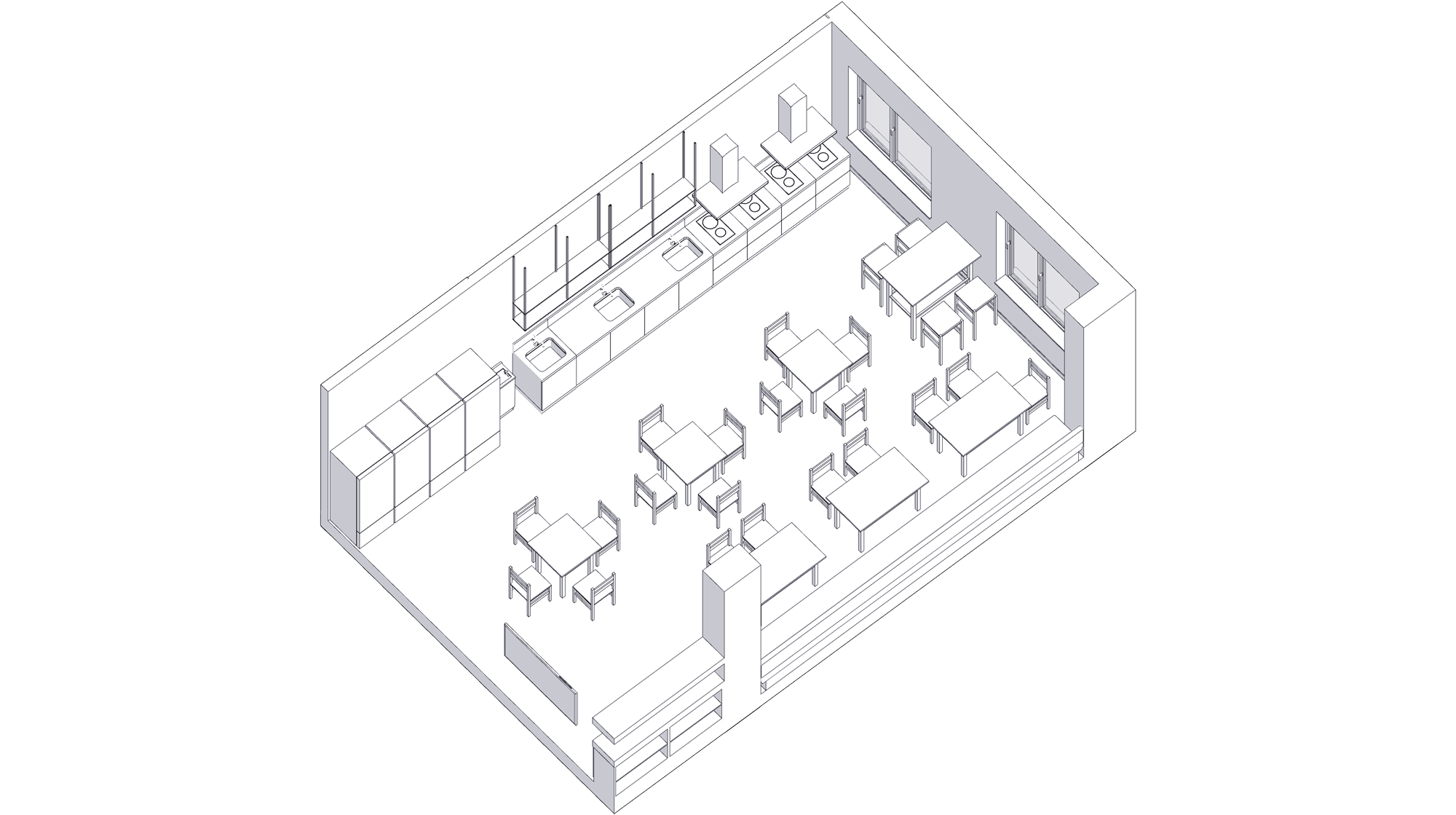 The kitchen and dining area is designed in soft, pleasant tones with bright accents that encourage socializing. It is equipped with all the necessary appliances for cooking and the number of seating spaces is arranged so that all residents on the floor can feel comfortable at any time.