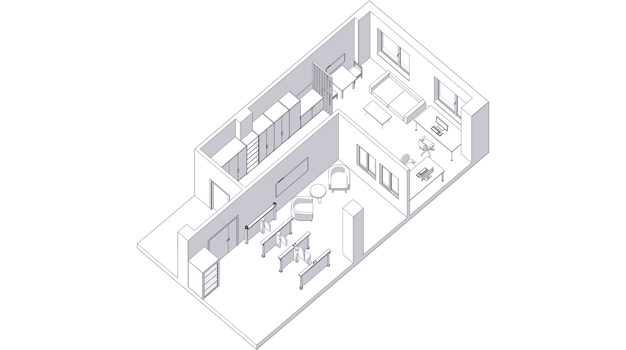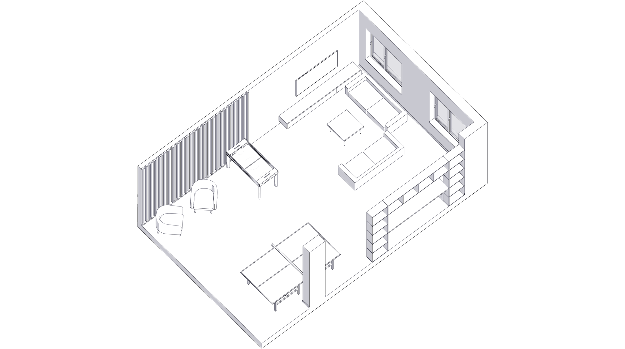 The studio developed the layout and functional zoning of all spaces, designed integrated storage systems, furniture and equipment for the living and common areas.