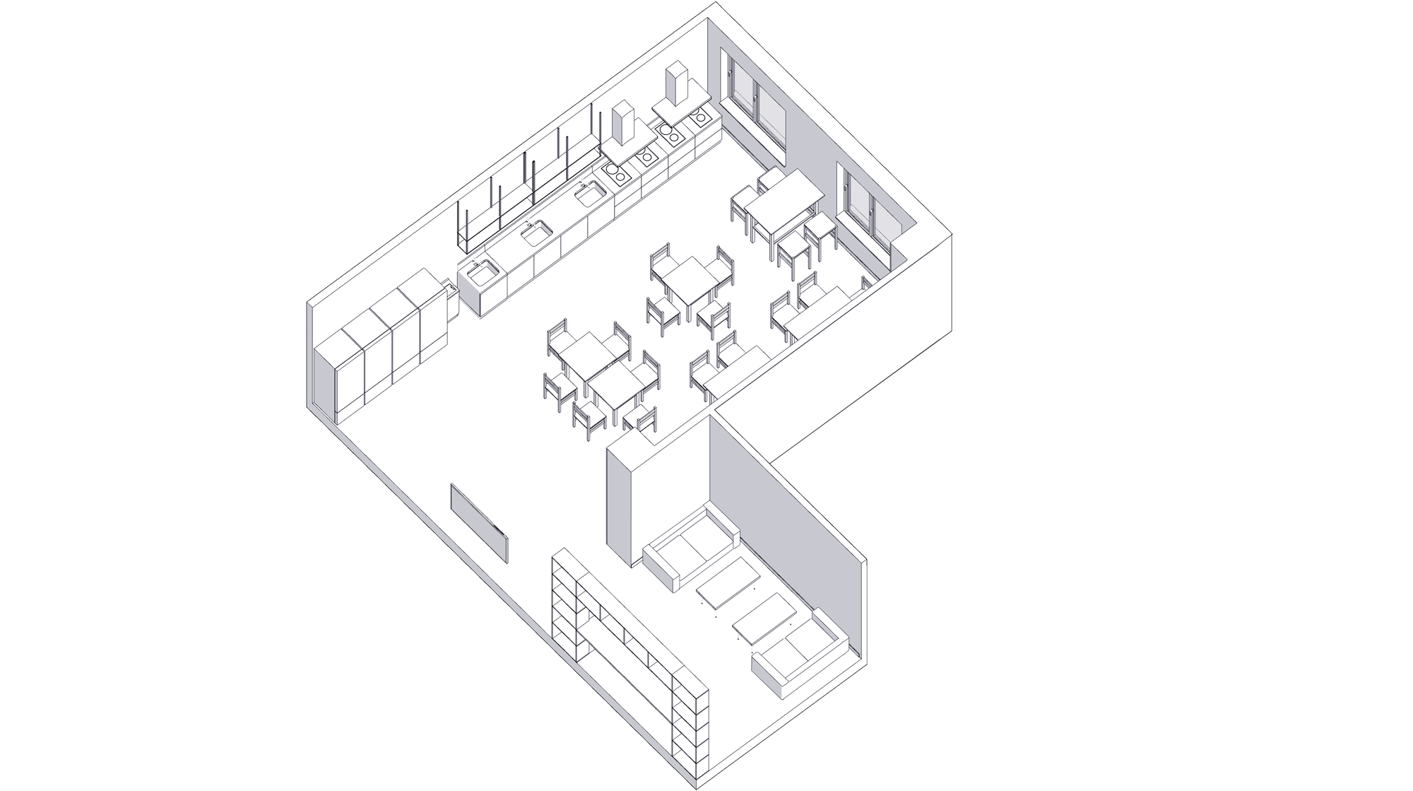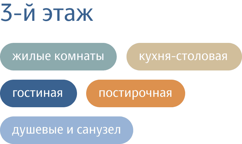 In the common relaxation areas, residents can interact, play board and computer games, watch TV on a comfortable sofa or read. Three variants of the living room layout have been designed, including one that combines it with the kitchen and dining area.