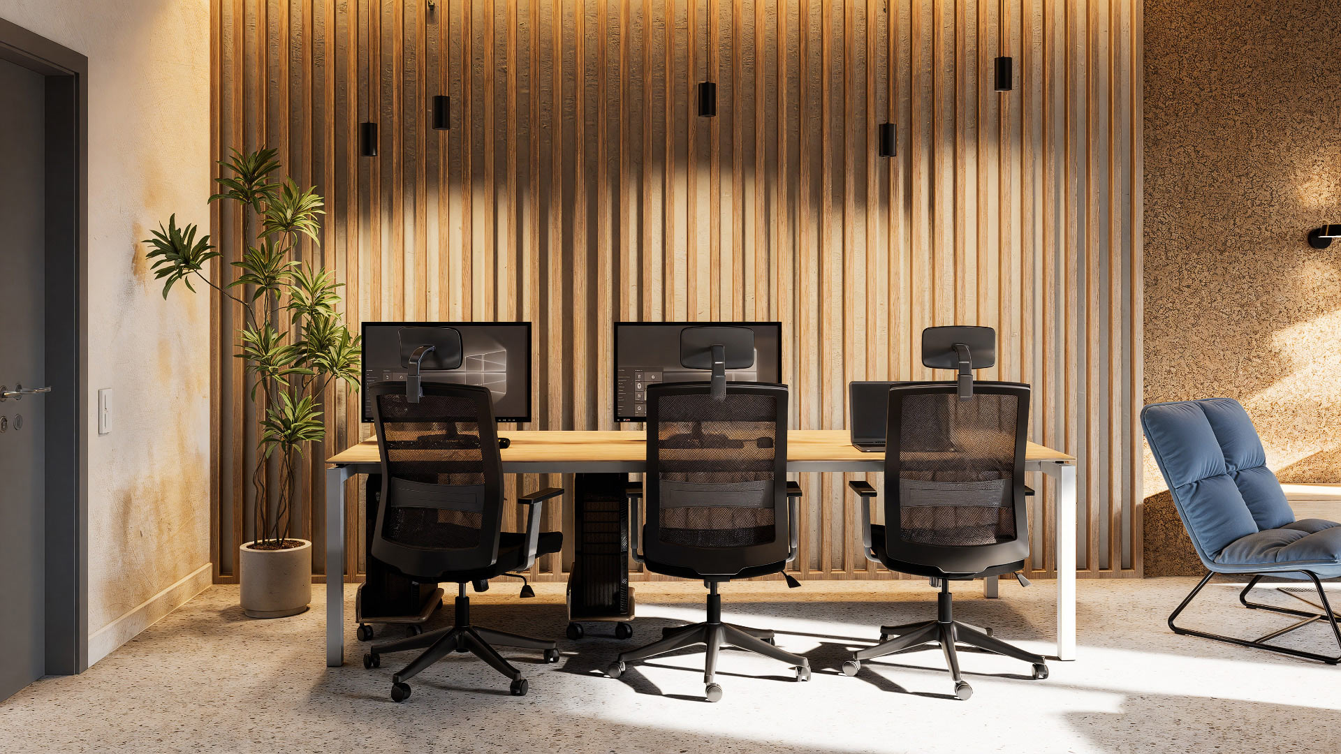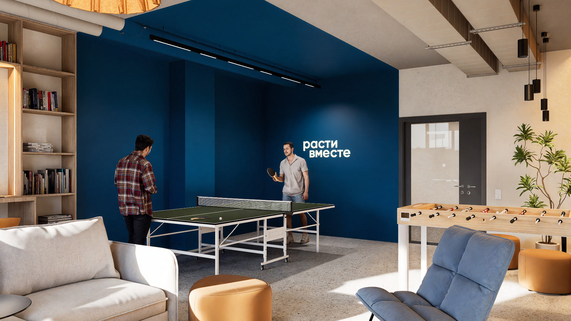 Neon signs reflecting the company’s values and motivating employees are integrated into the interiors. We also developed the typographic design for these and other decorative elements.