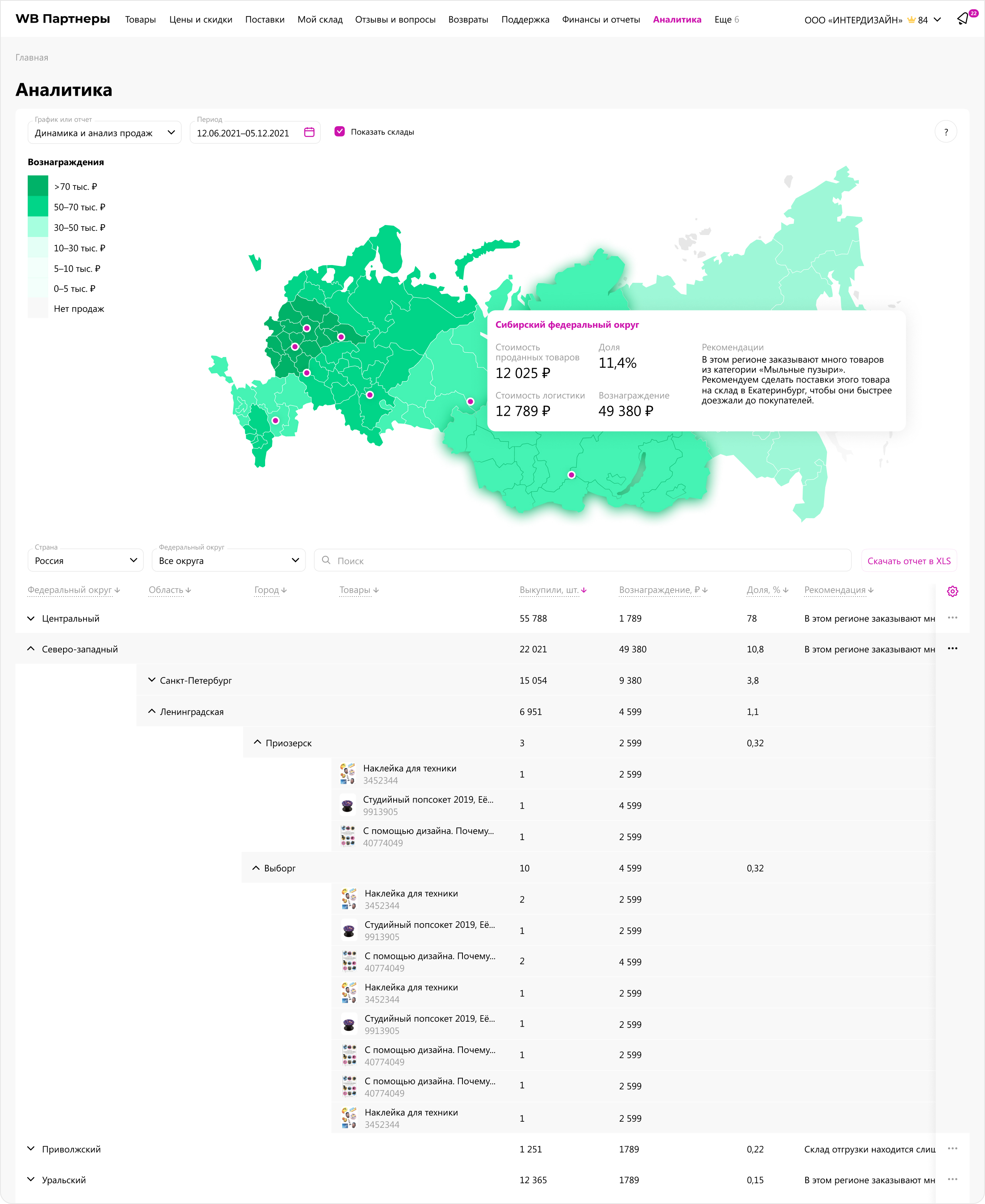 Active shipments are tracked in real time, while new transactions are broken down into simple and logical steps. The system provides timely information about the specifics of turnover and suggests the most favorable options: make one shipment or two, use boxes with sets or monopallets, ship products to a warehouse in Krasnodar or Podolsk, plus many other important options.
