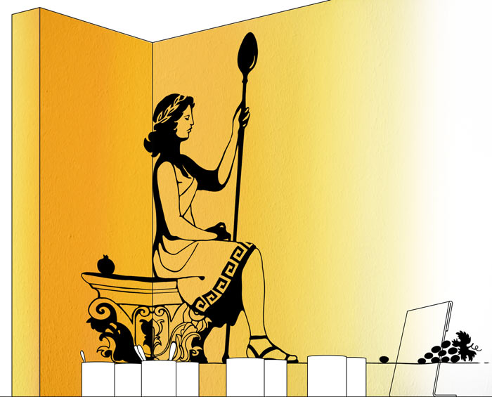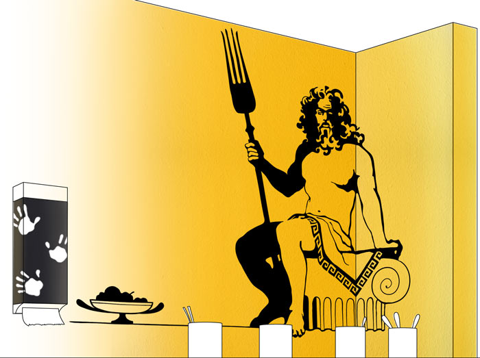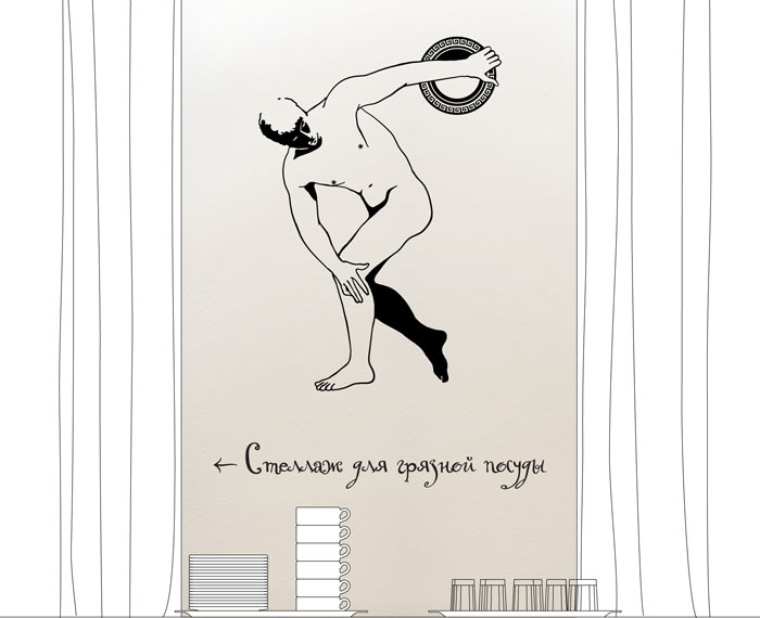 Just like the rest of Yandex office space, the cafeteria on the first floor of the Yandex building lacked navigation. Themed illustrations, menus and price tags for the café were created at the studio.