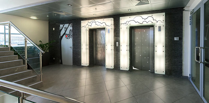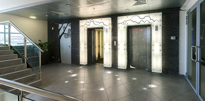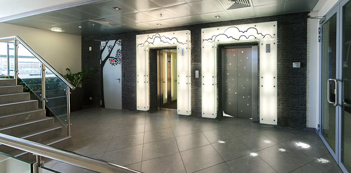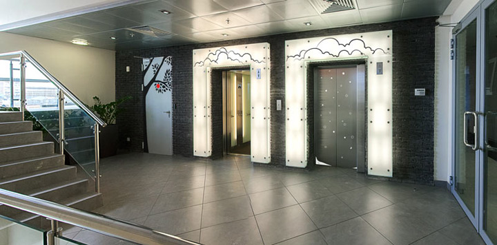 Illustratoins and miscellaneous extras supporting the floor’s theme by elevators.