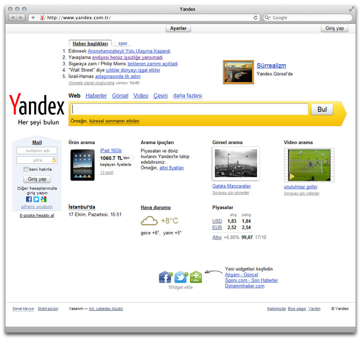 The main page of Turkish Yandex is very straightforward and convenient with social networking widgets, brand new weather icons, and nicely designed Yandex mail.