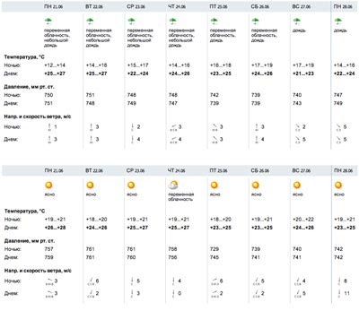 Simple pictograms provide a great illustration of what kind of weather we are in for in the week ahead. The upper table is for Moscow, the lower one—for Athens