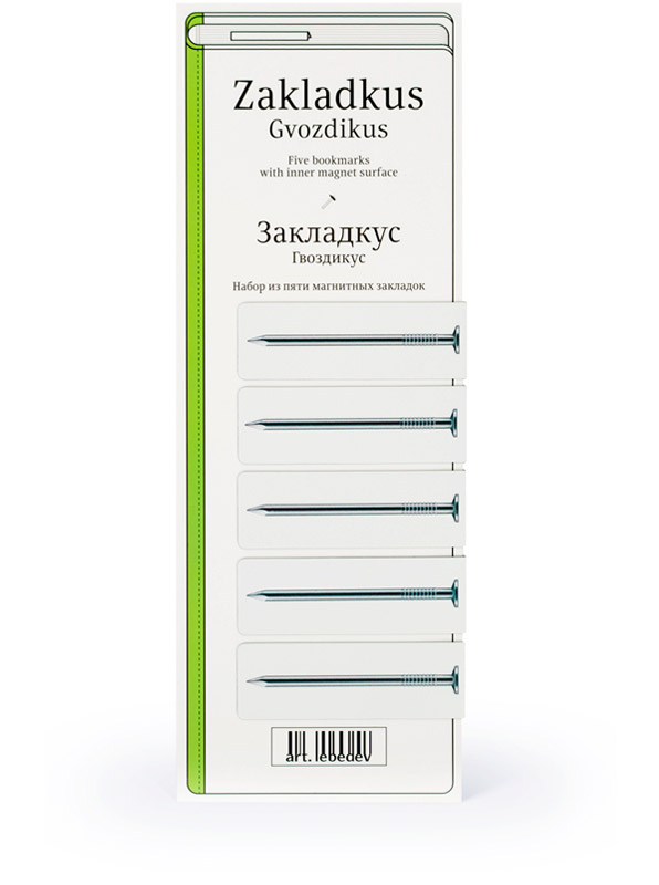 Zakladkus Gvozdikus is a set of five magnetic bookmarks, conveniently grabbing the page and securely holding it until your return. Will work with any book.